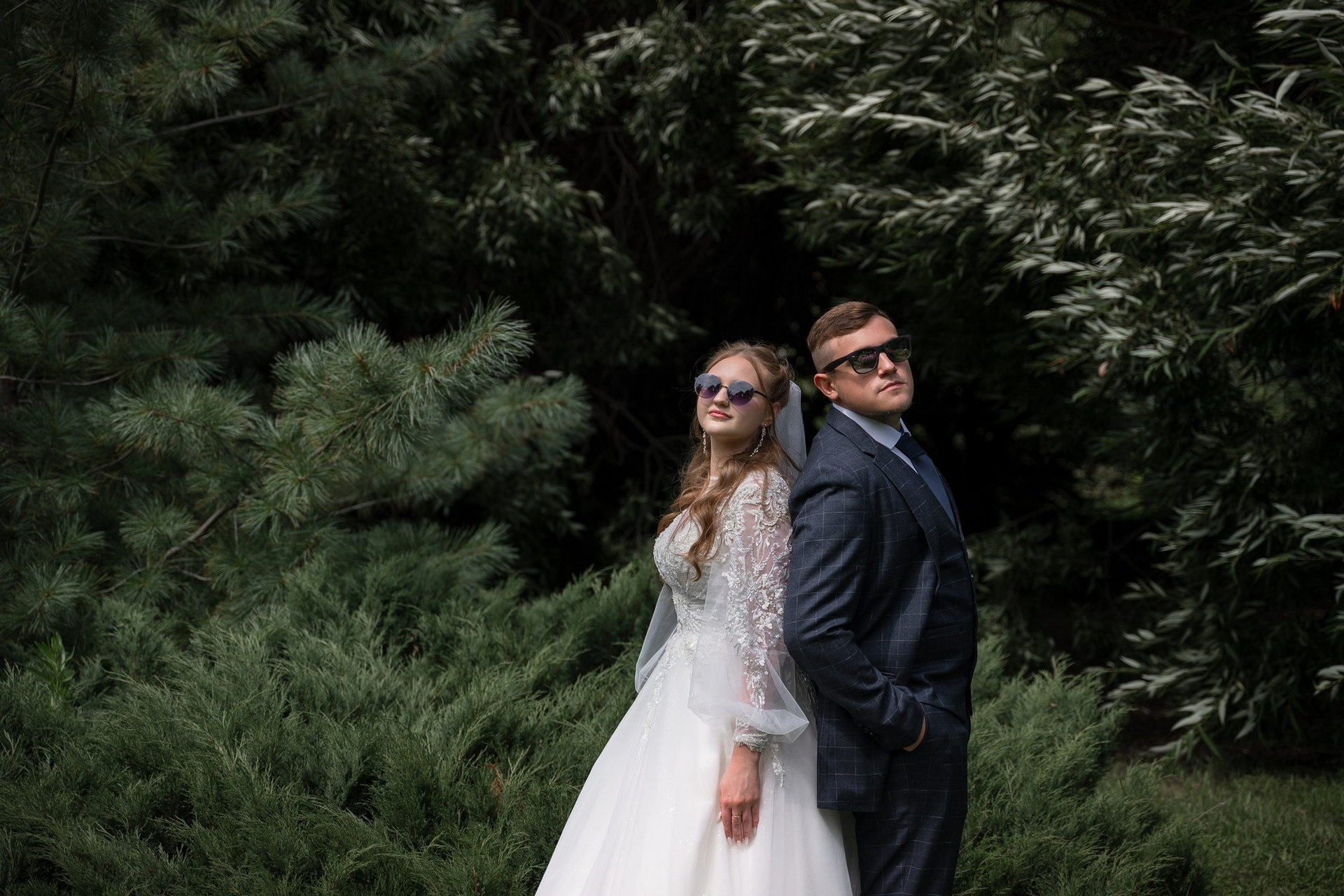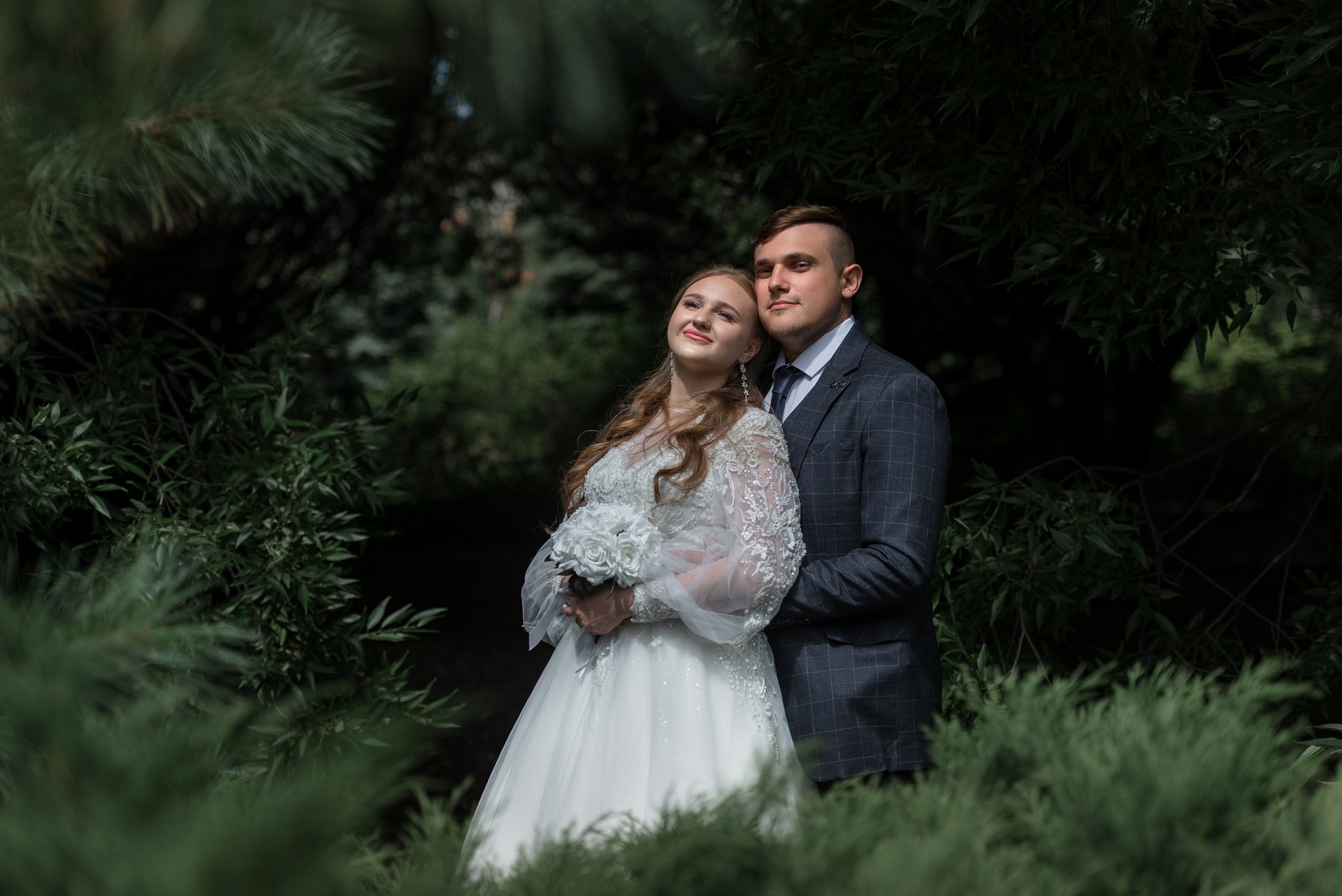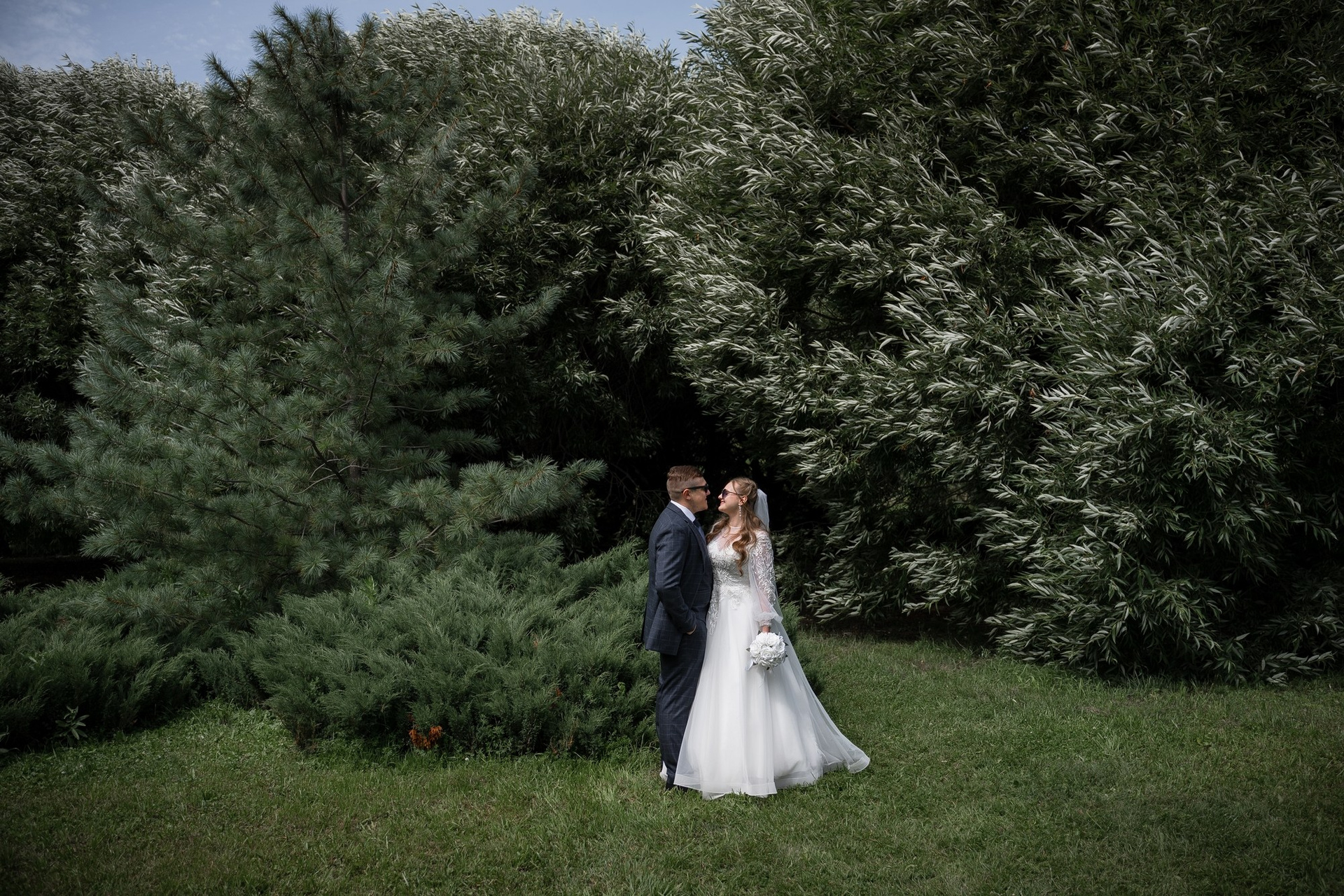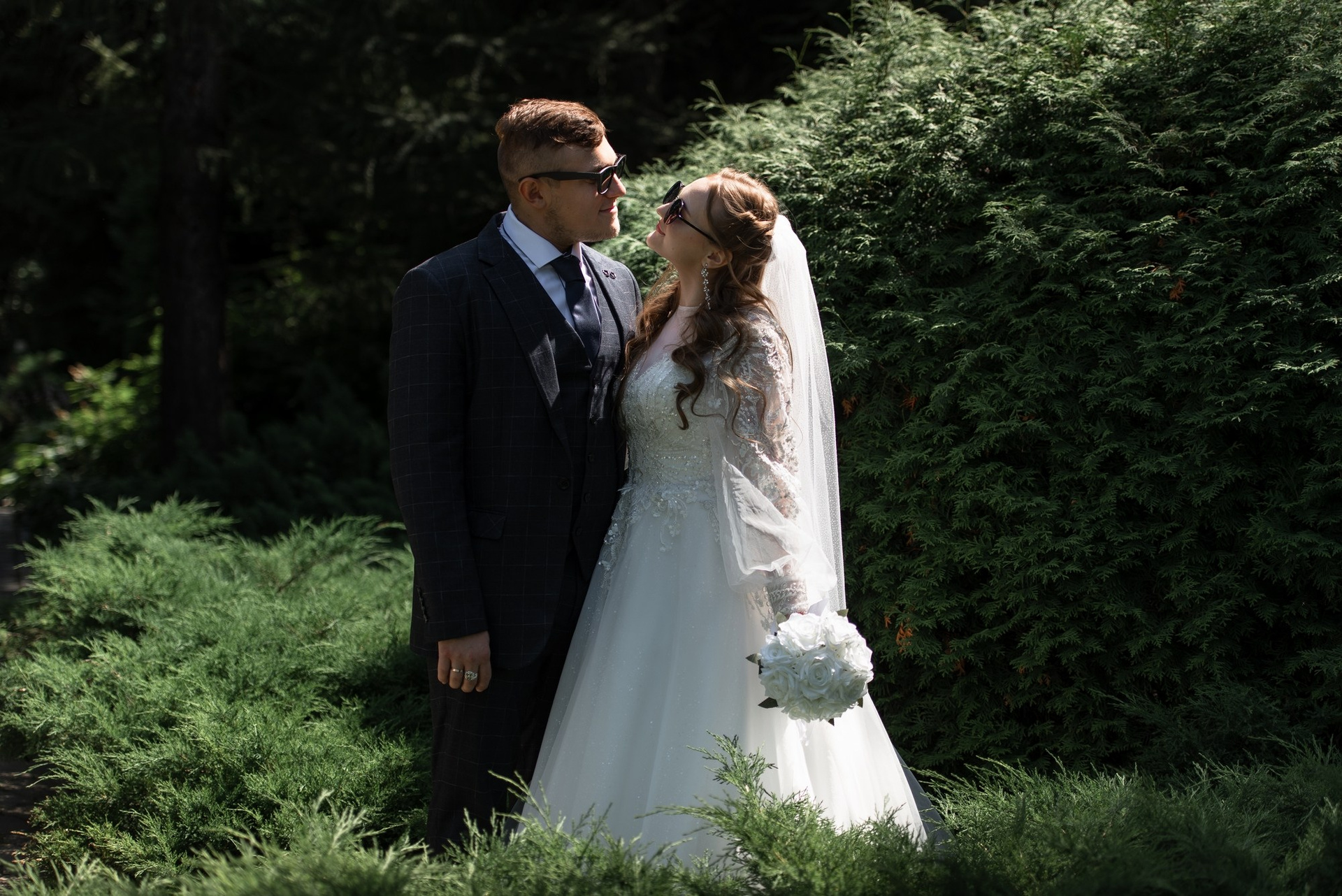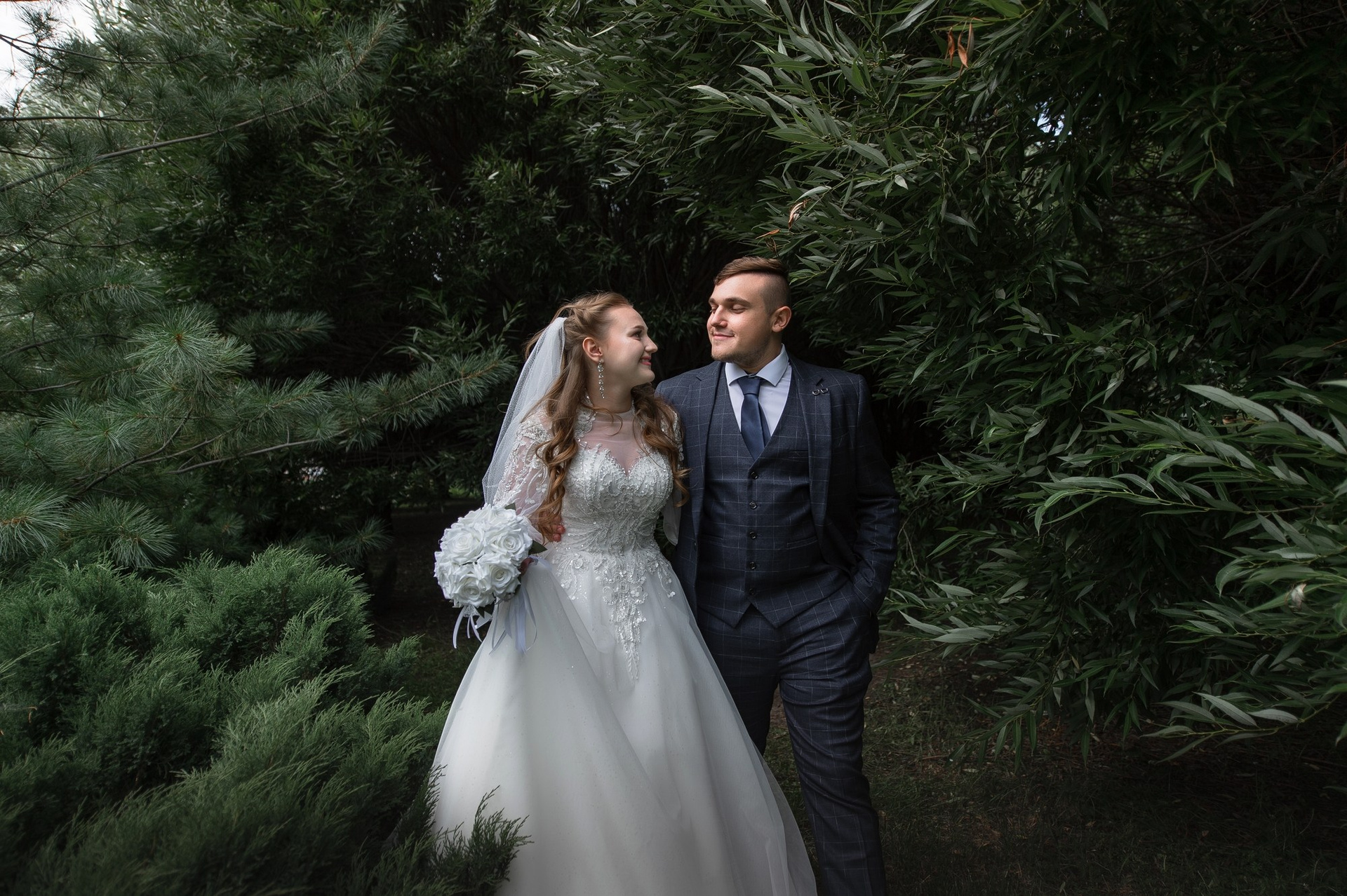 Свадебная фотосъёмка из двух блоков: сначала погуляли в зелени в дендропарке, а затем заехали в студию.