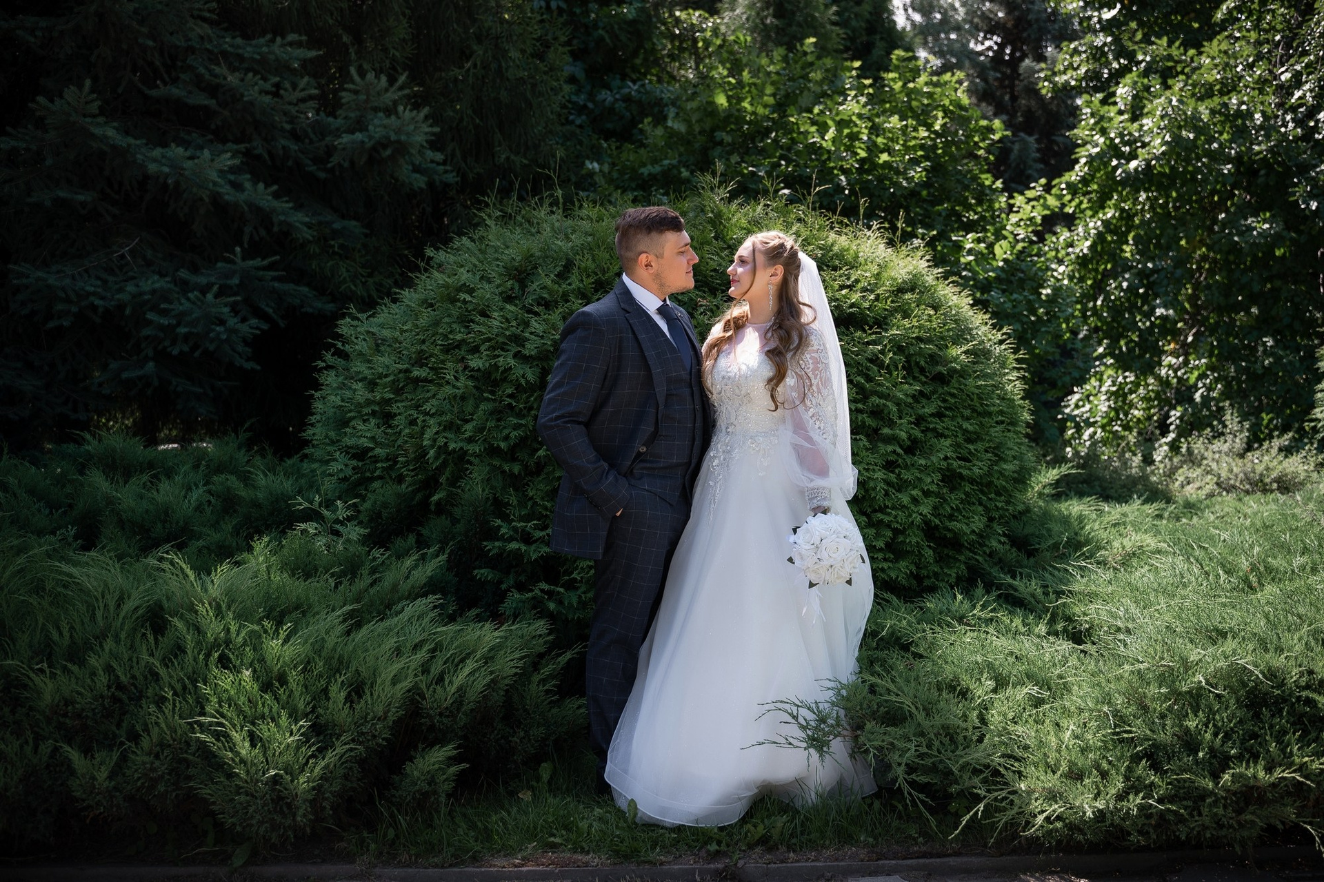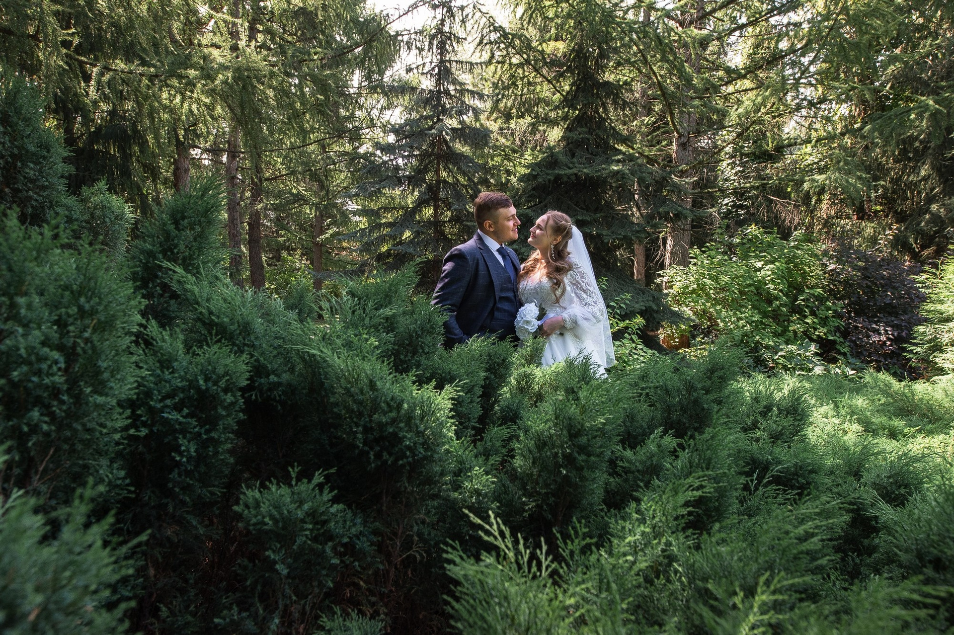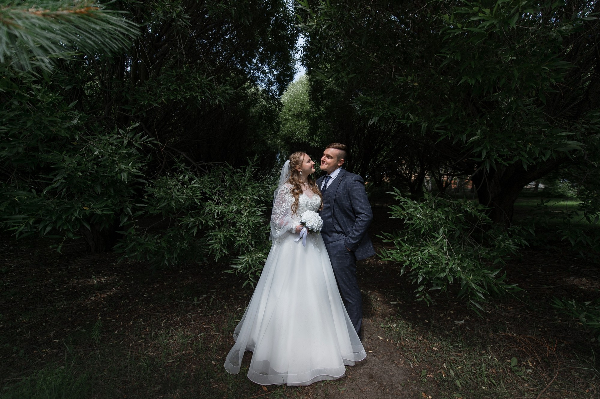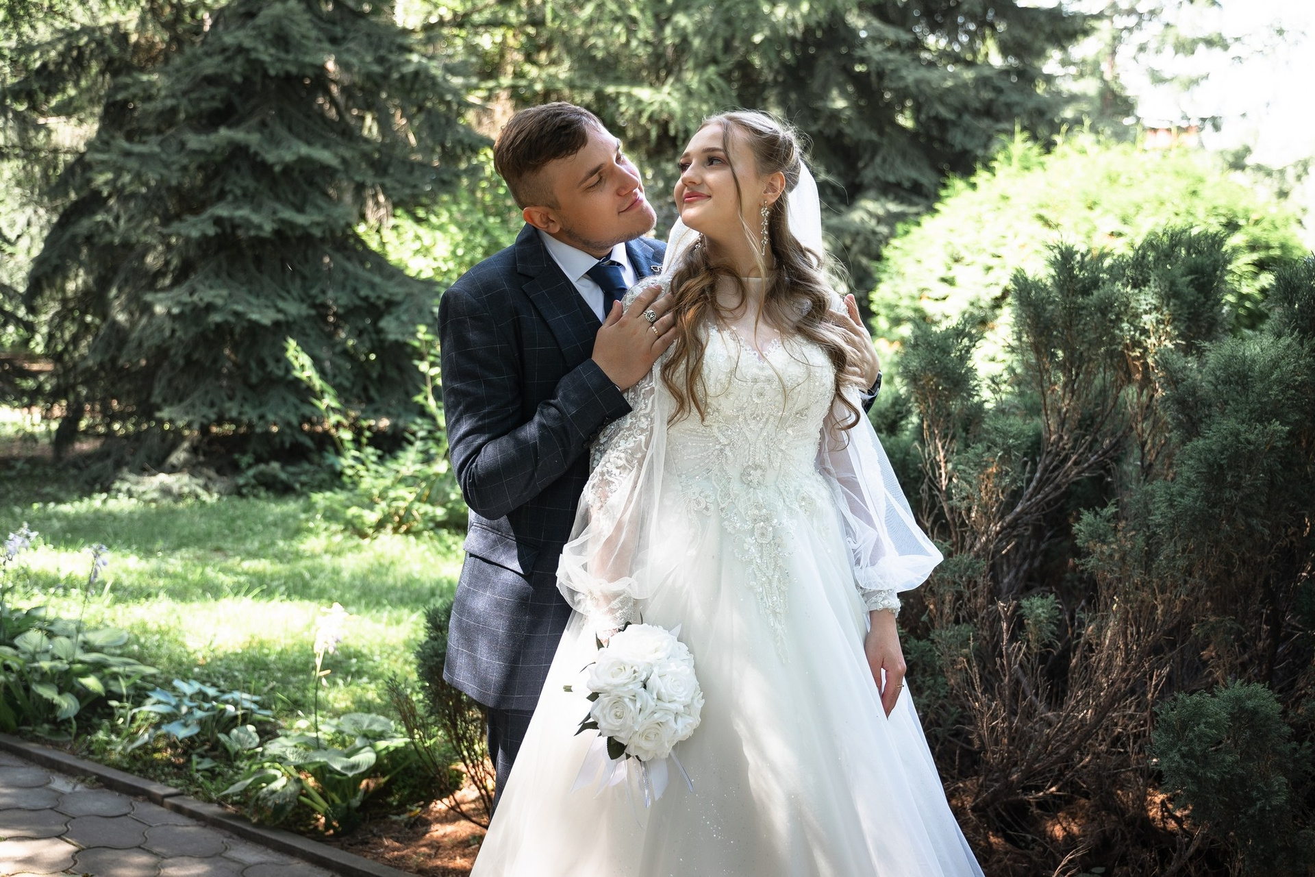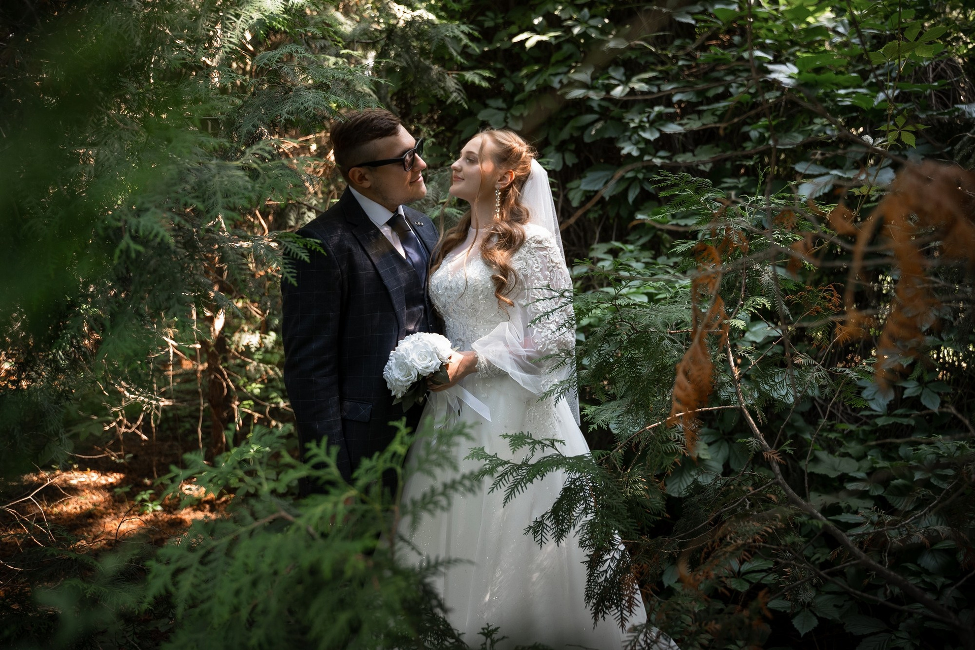 Свадебная фотосъёмка из двух блоков: сначала погуляли в зелени в дендропарке, а затем заехали в студию.