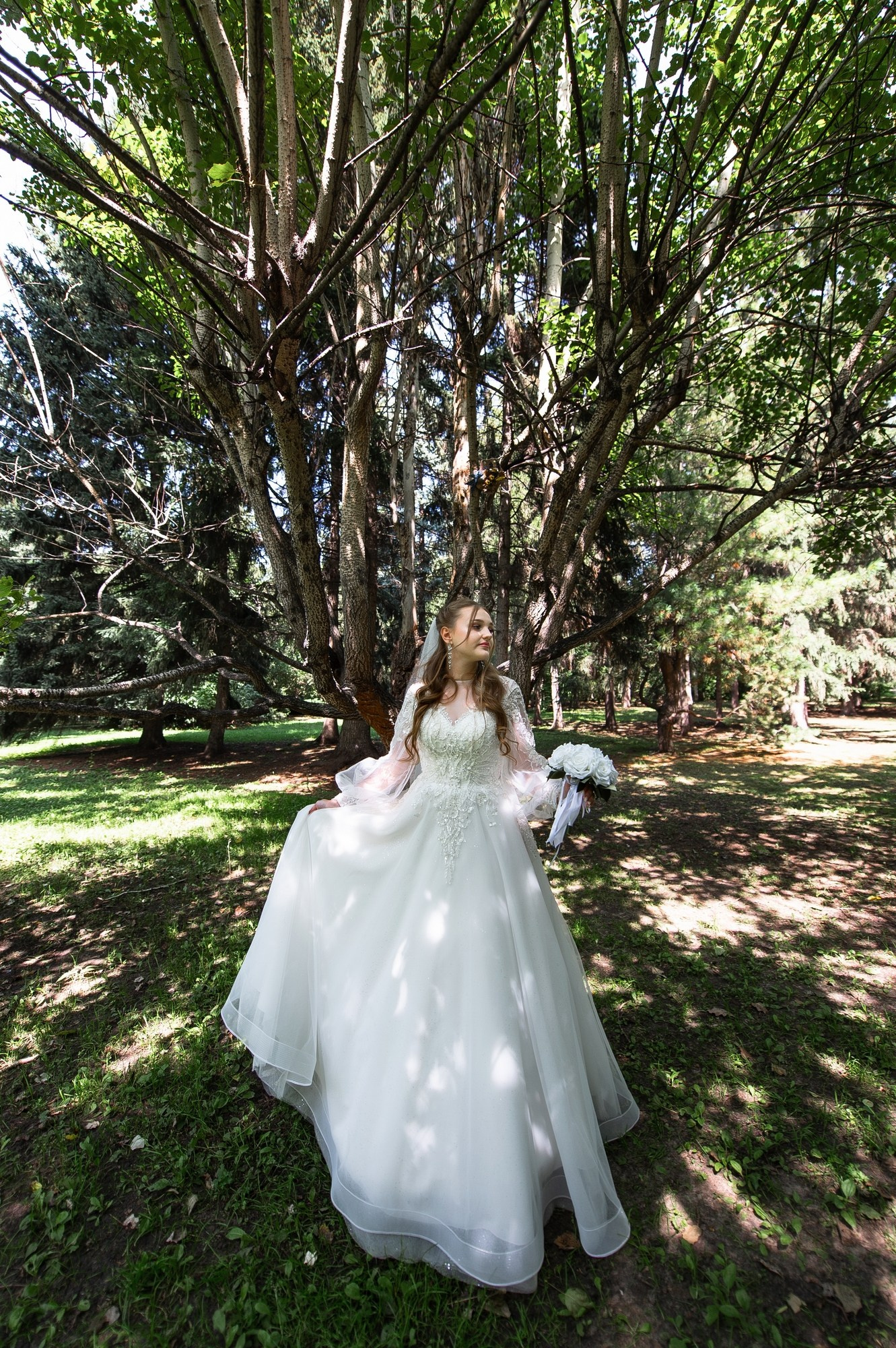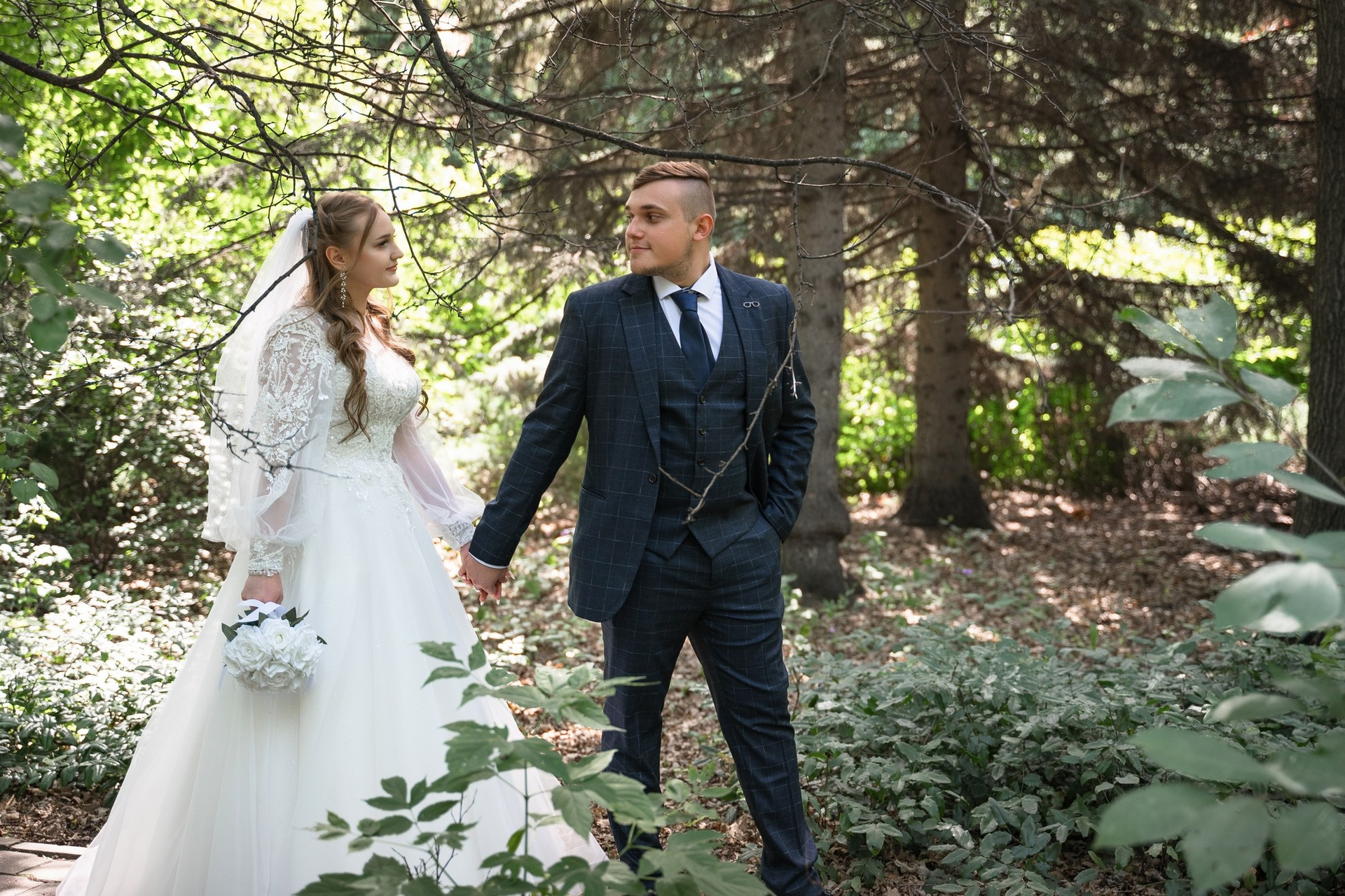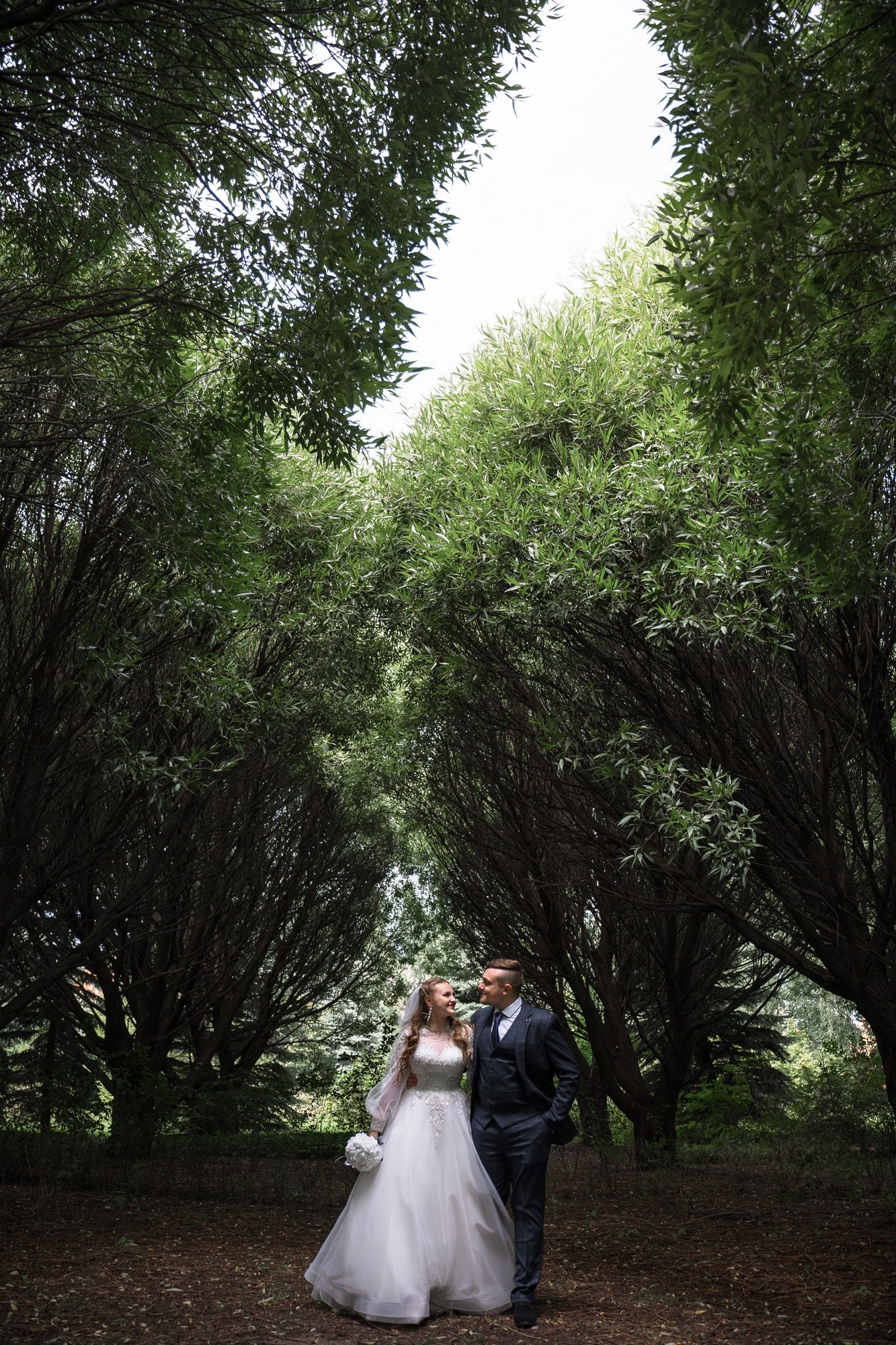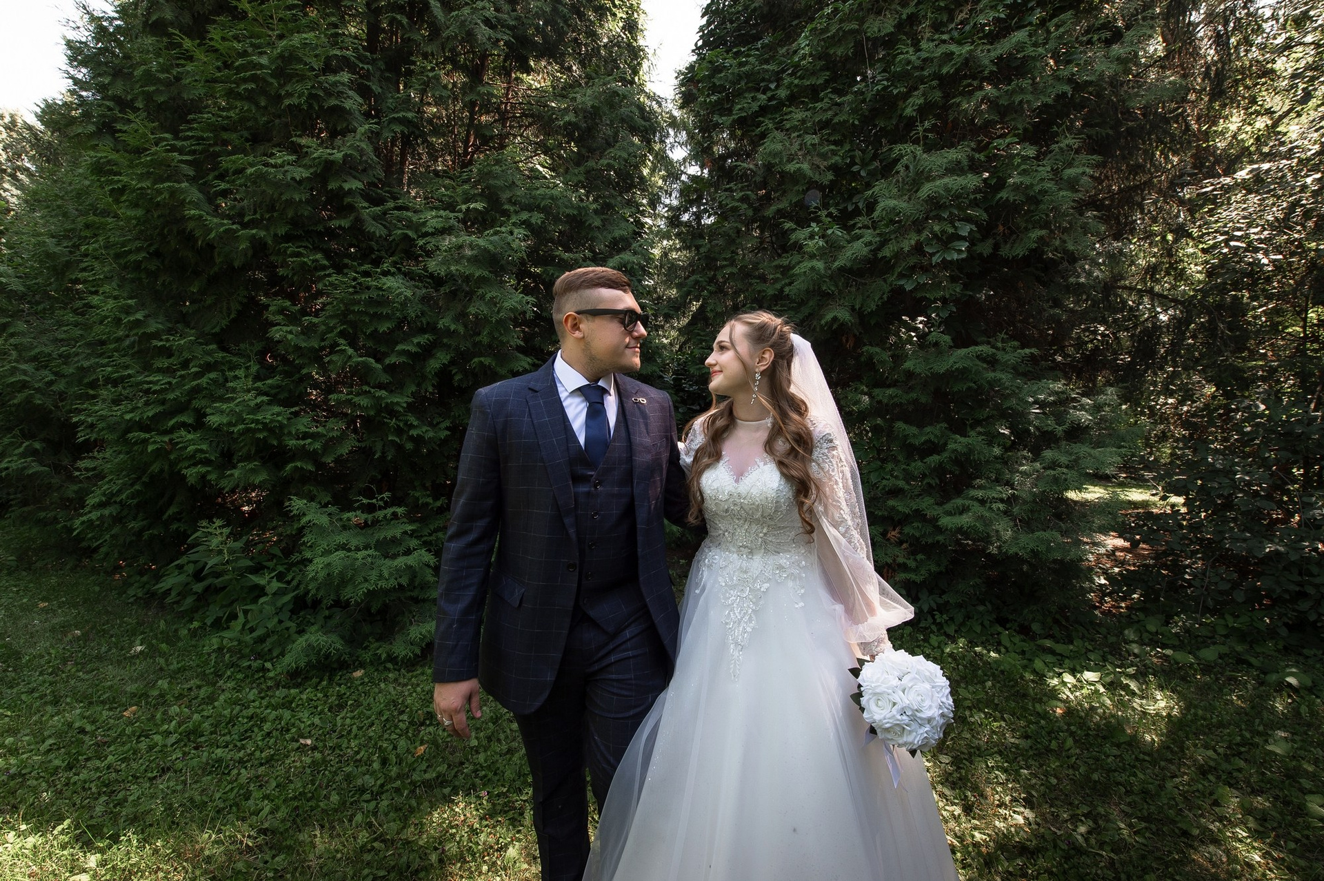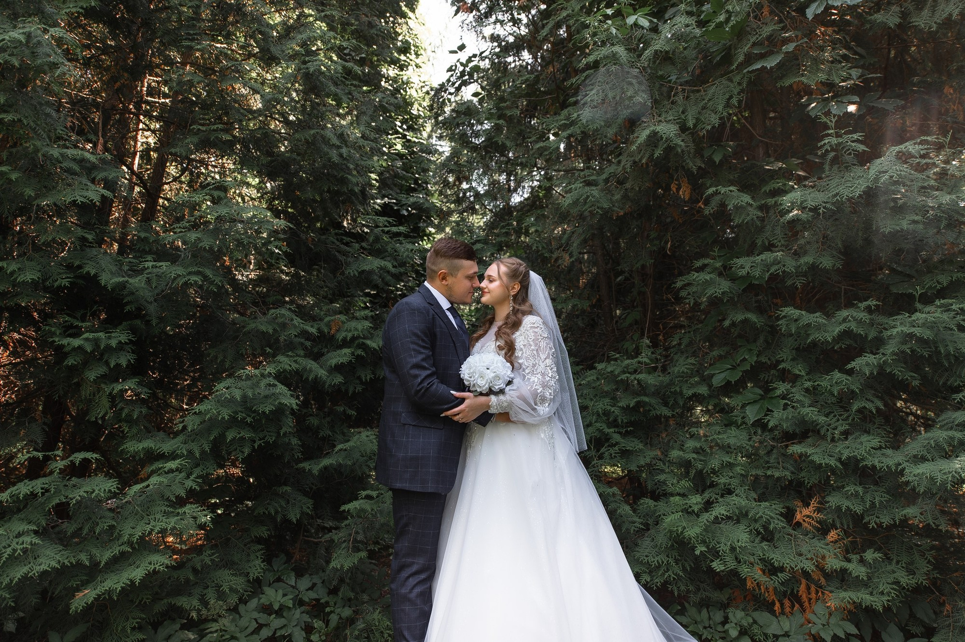 Свадебная фотосъёмка из двух блоков: сначала погуляли в зелени в дендропарке, а затем заехали в студию.