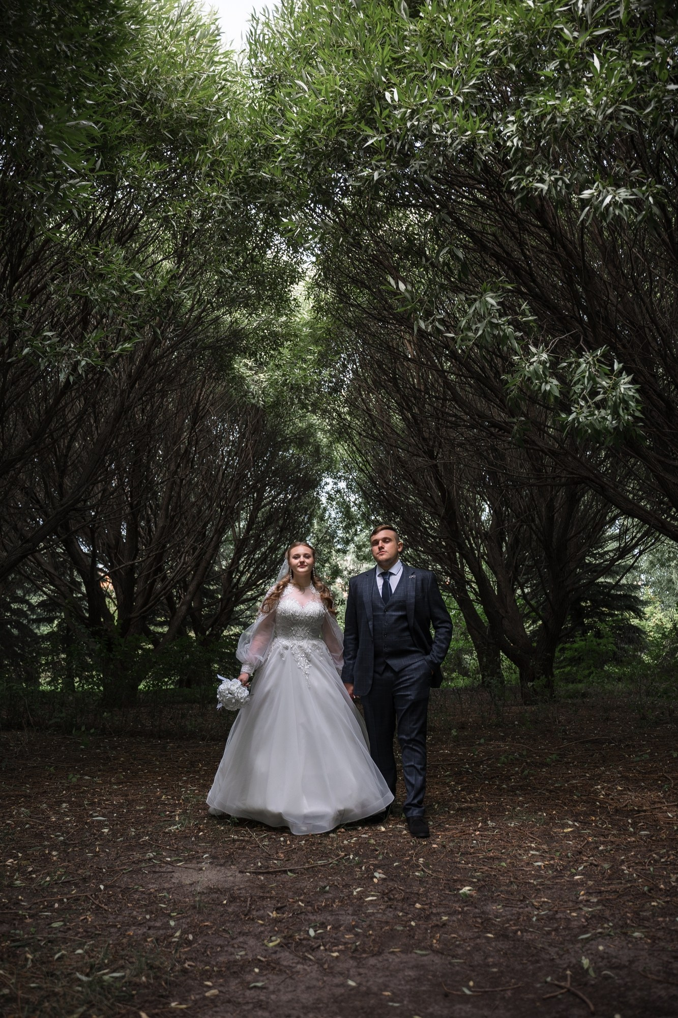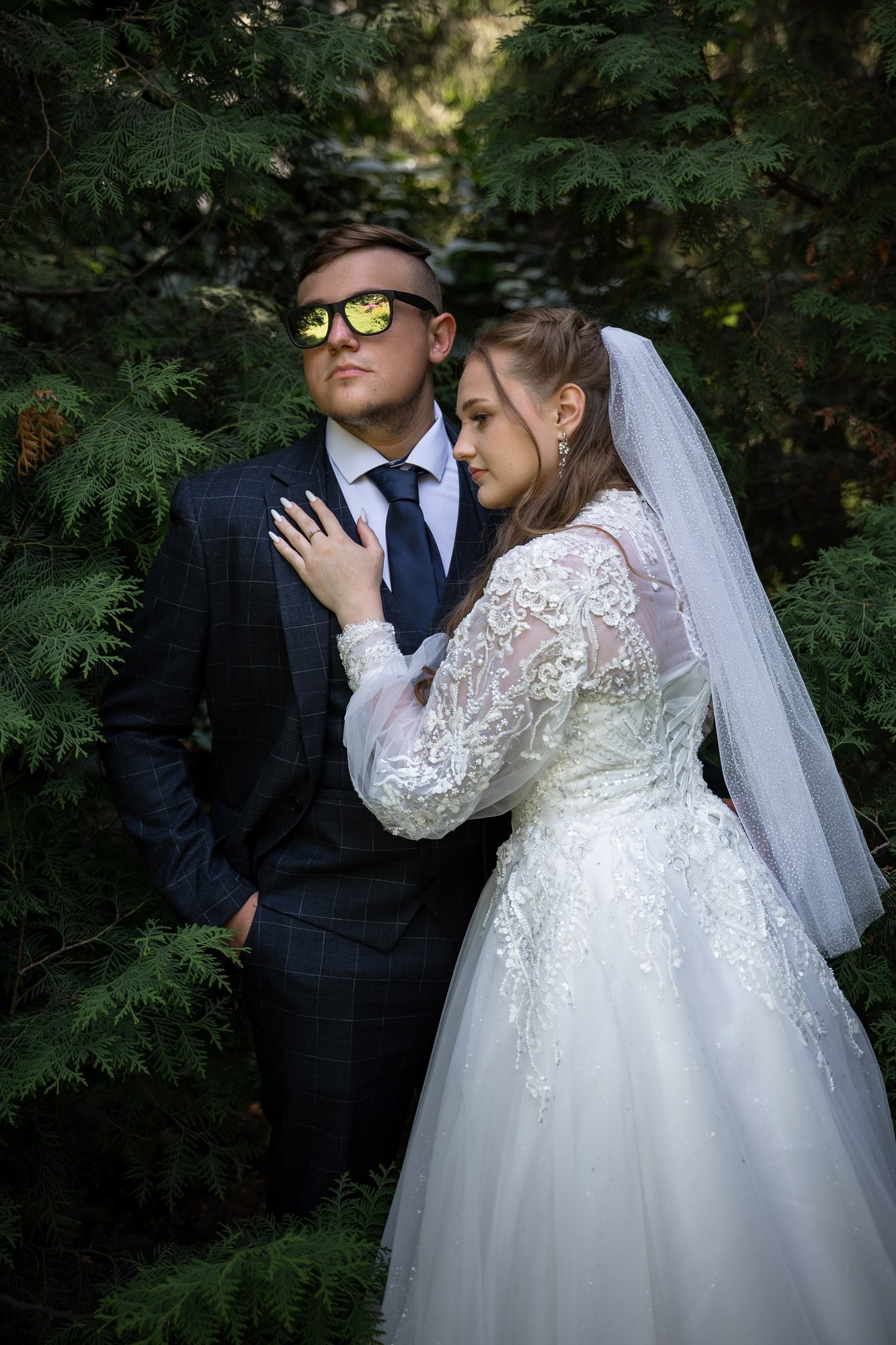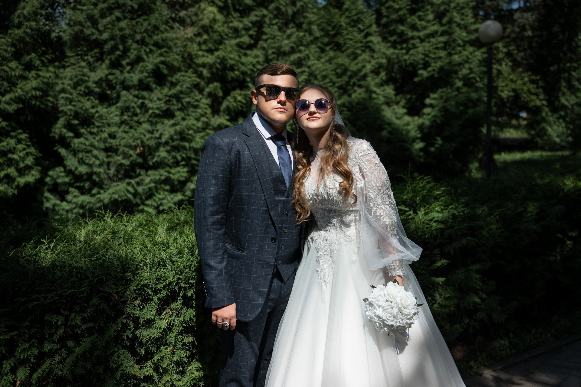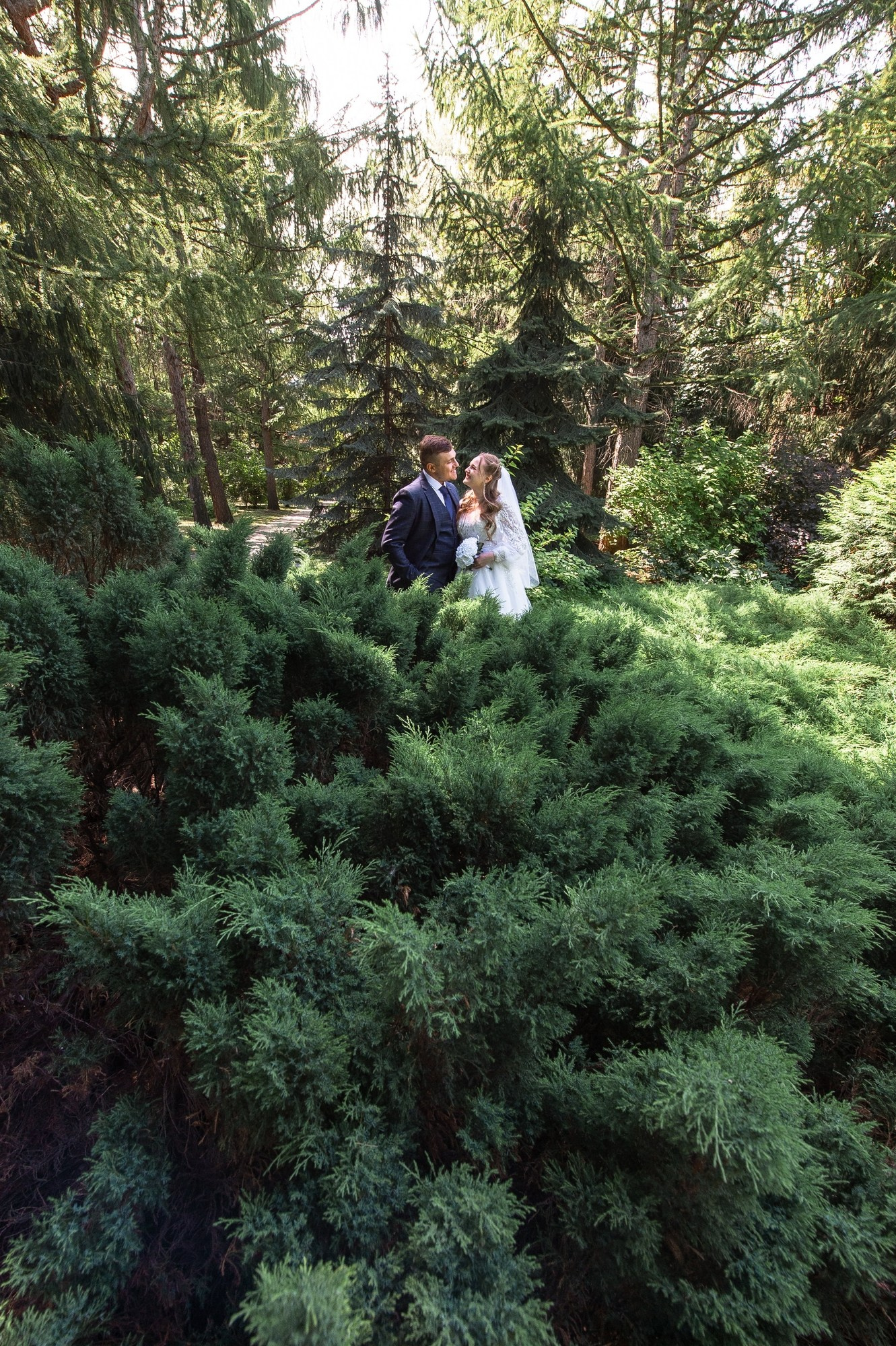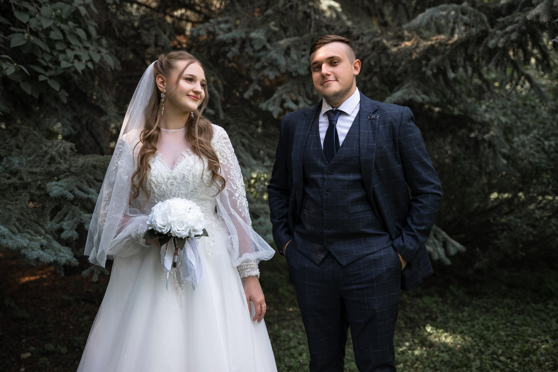 Свадебная фотосъёмка из двух блоков: сначала погуляли в зелени в дендропарке, а затем заехали в студию.