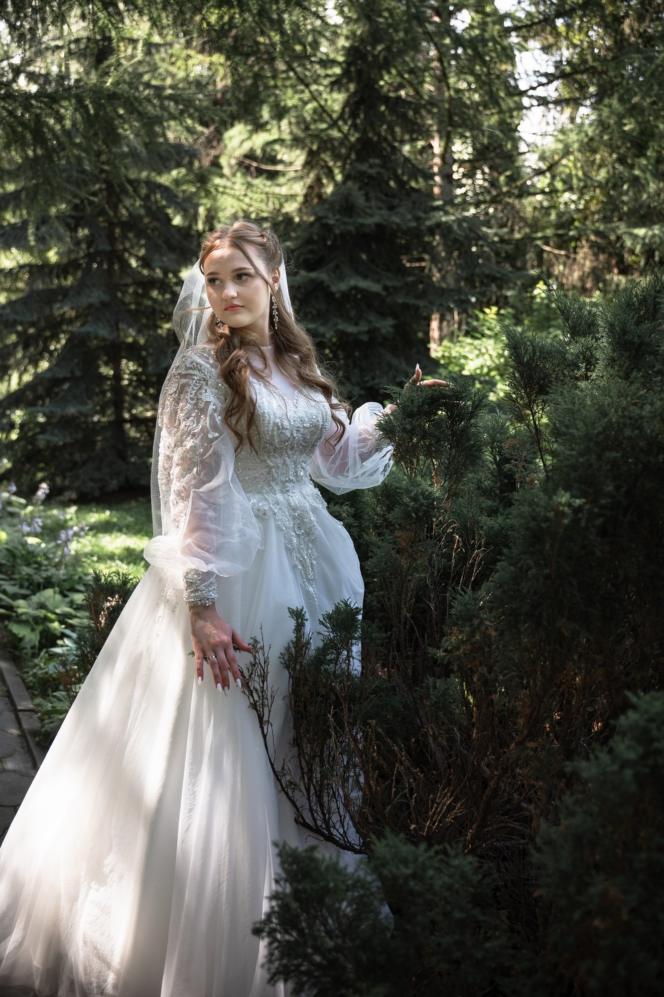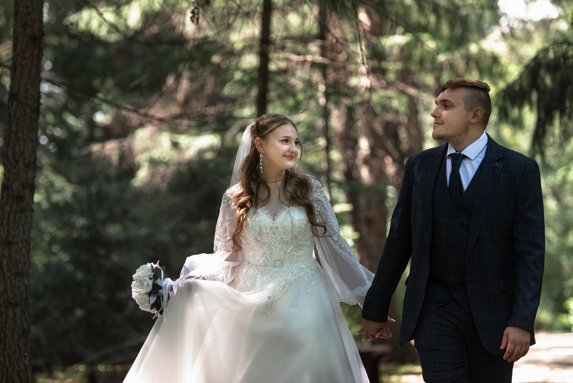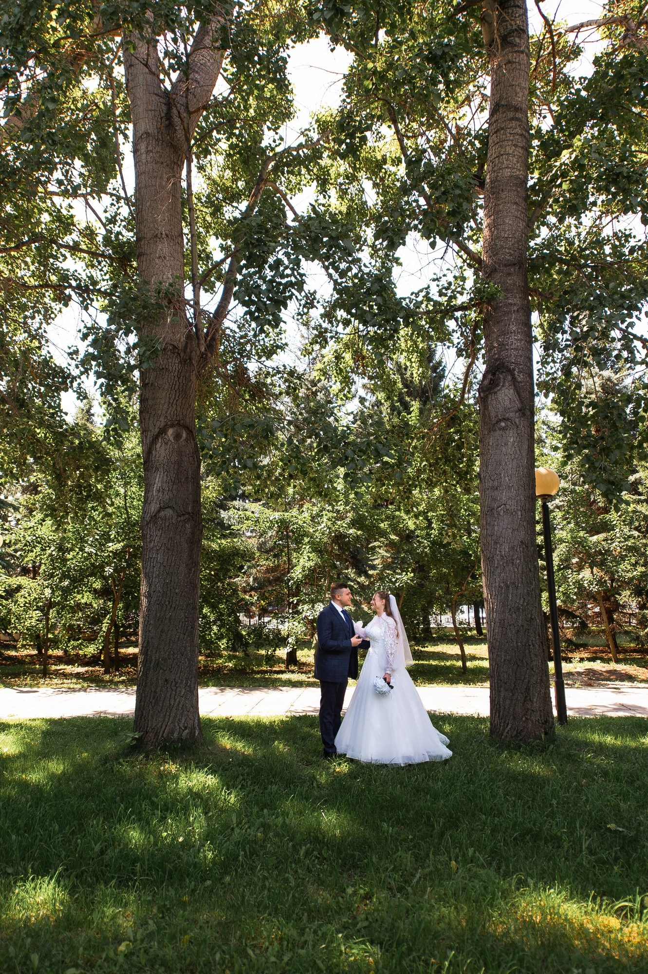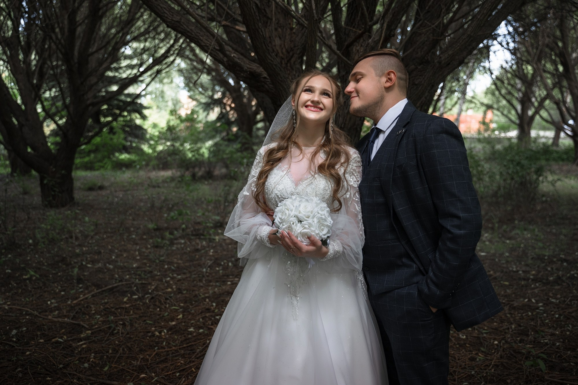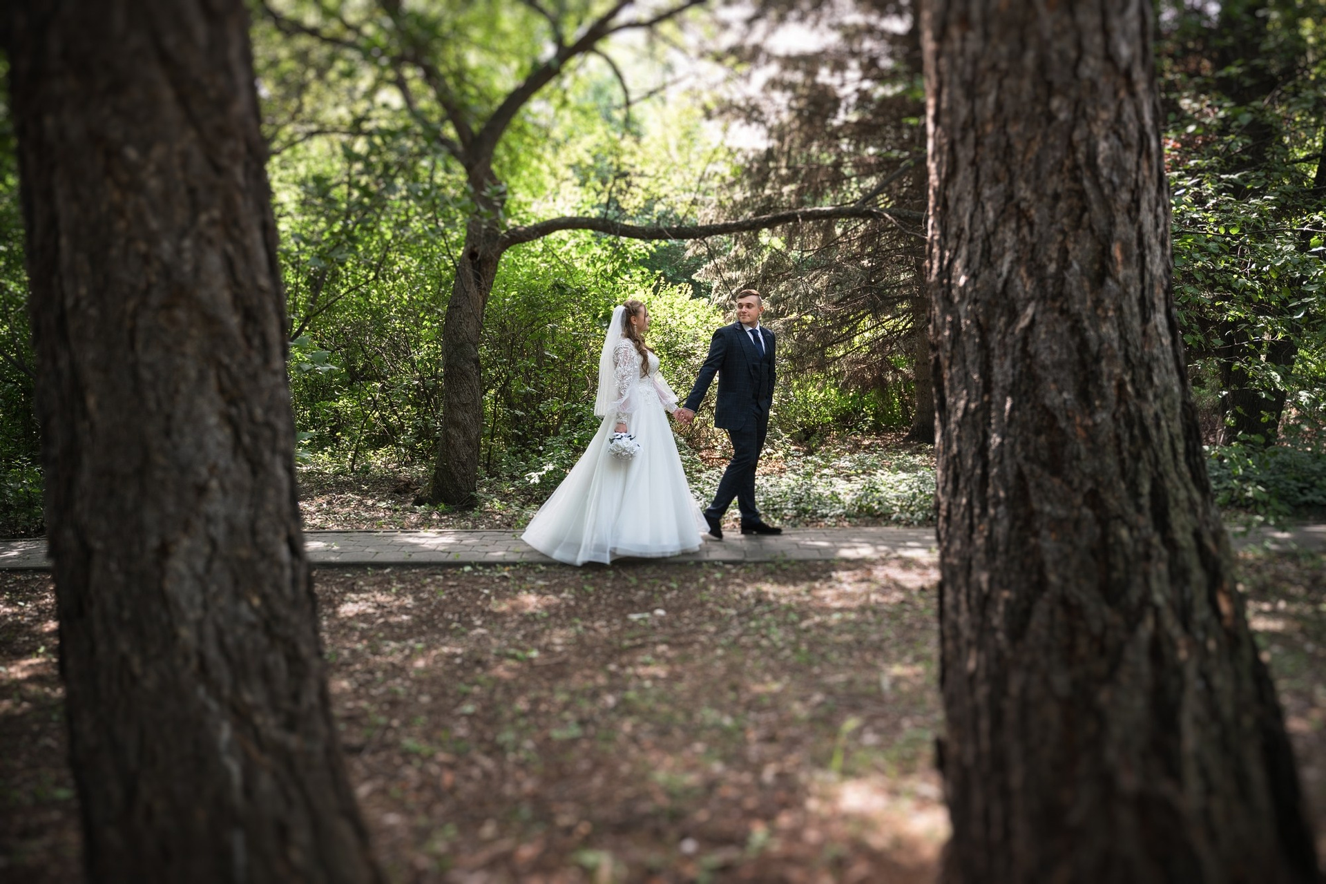 Свадебная фотосъёмка из двух блоков: сначала погуляли в зелени в дендропарке, а затем заехали в студию.