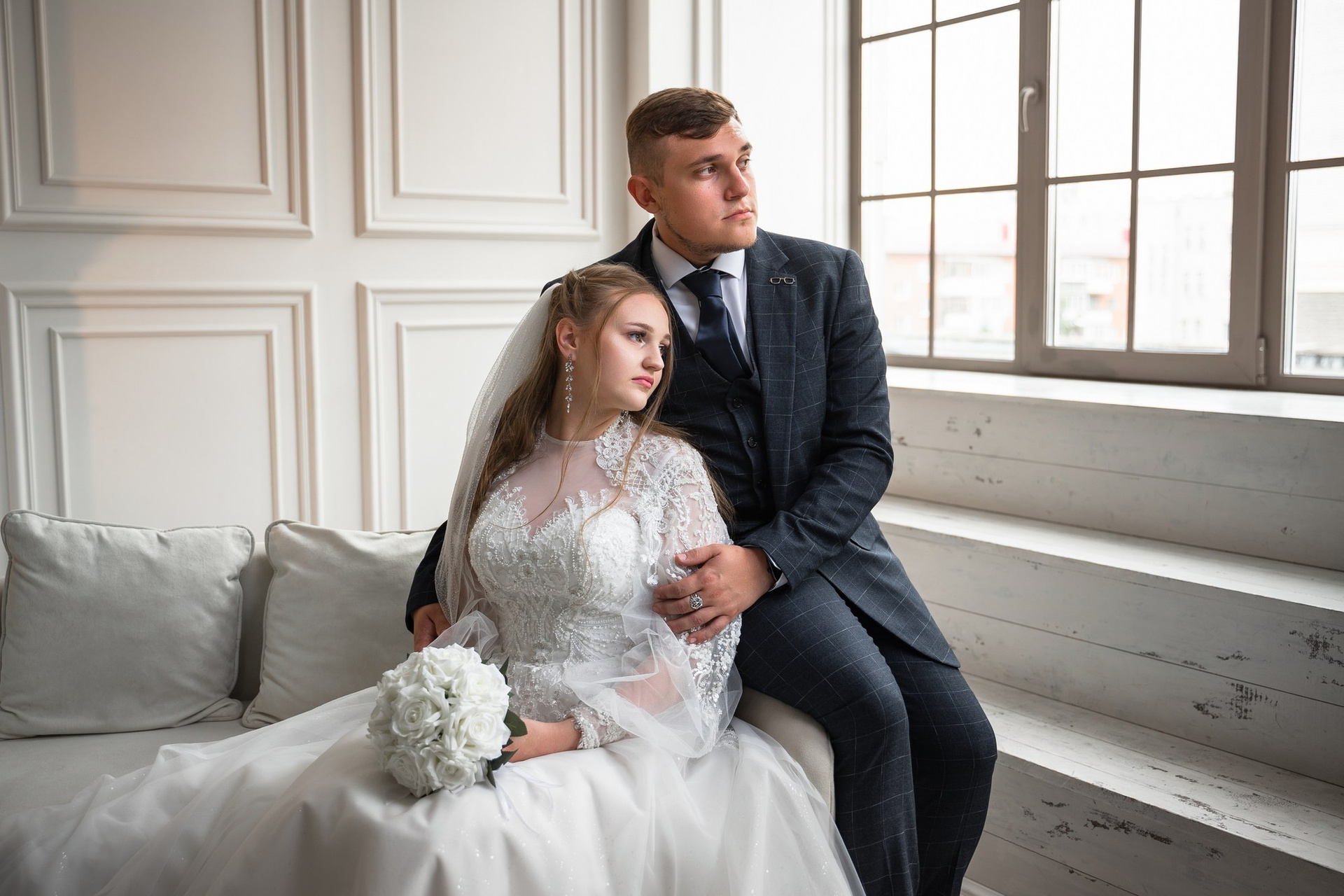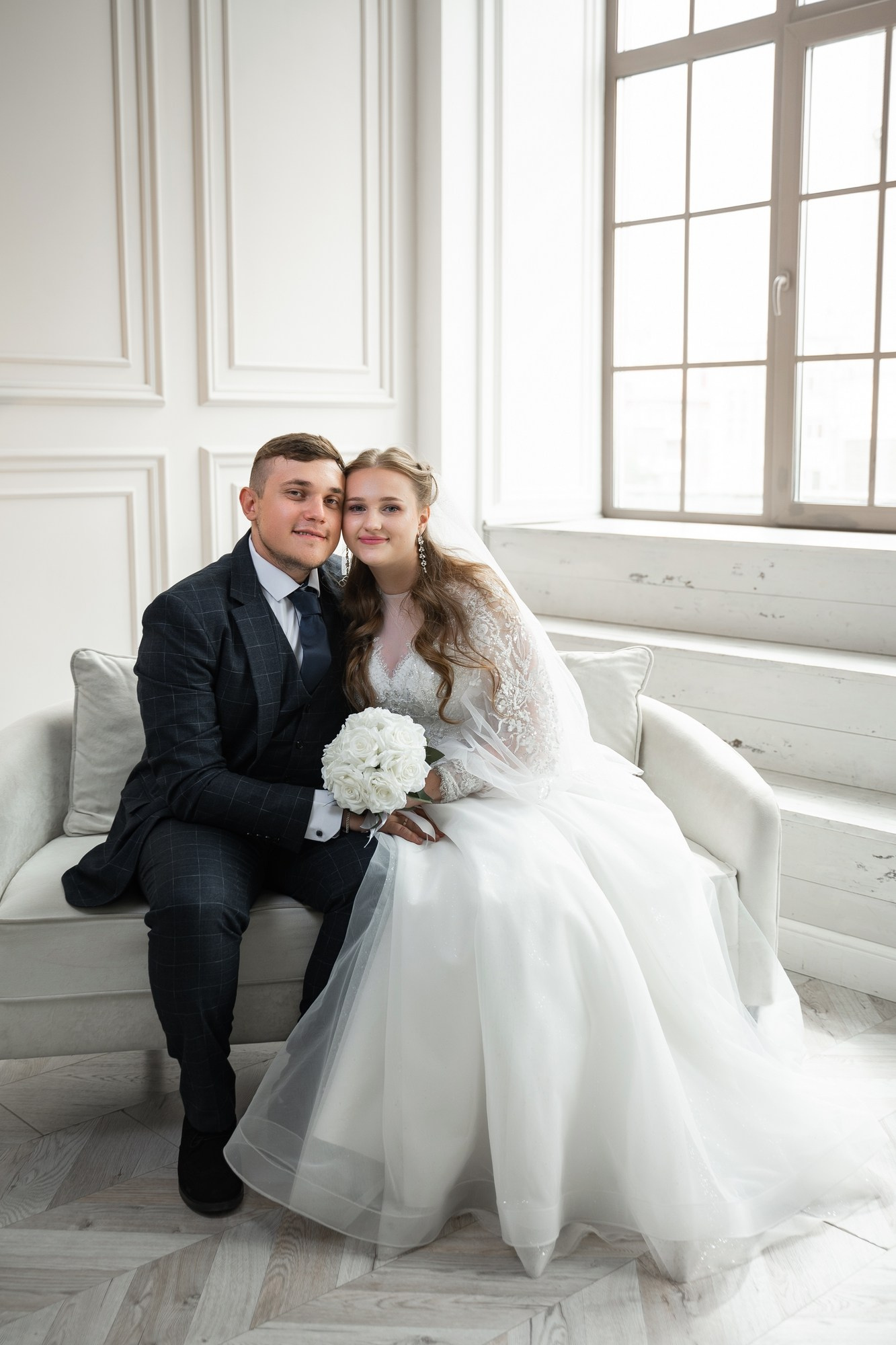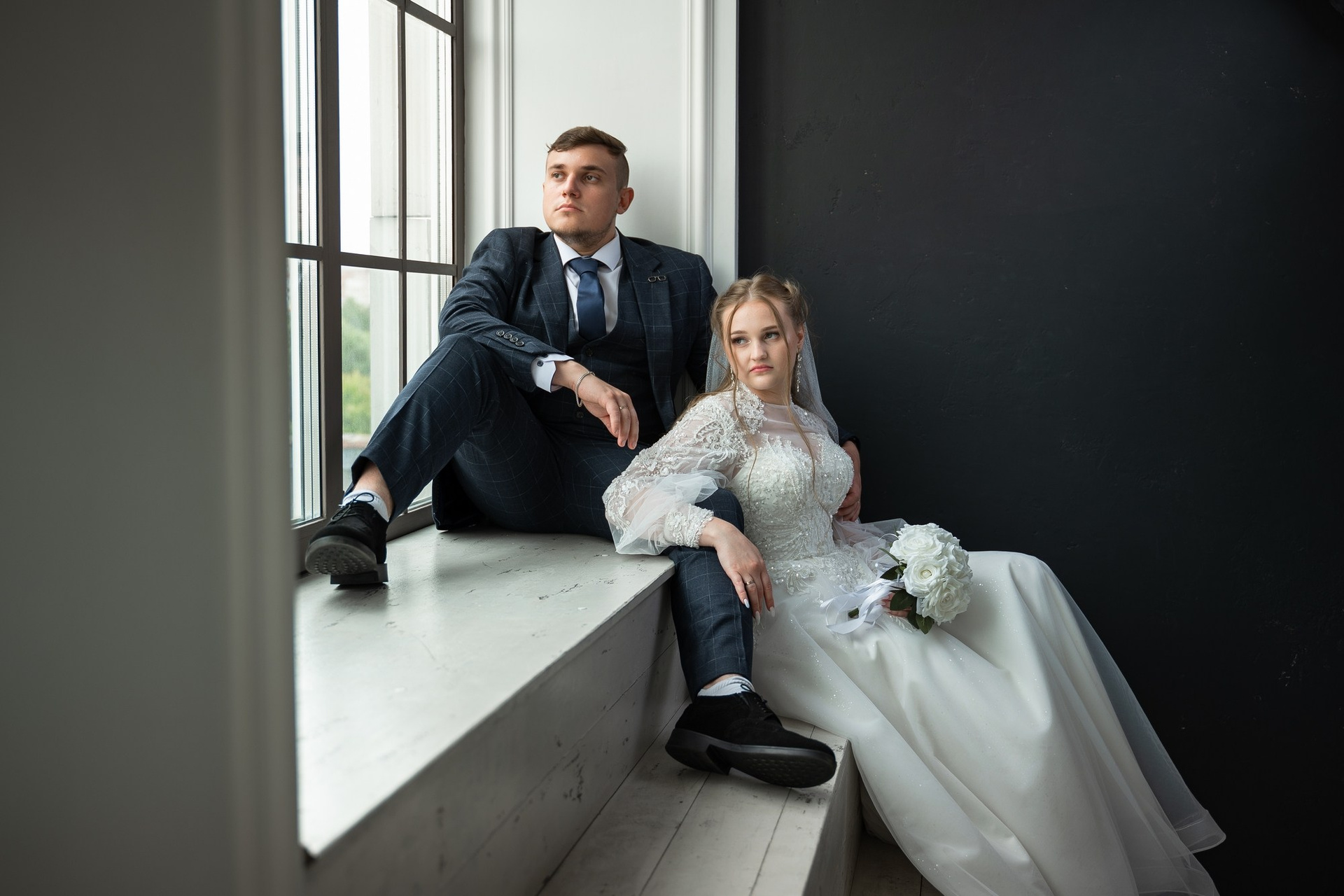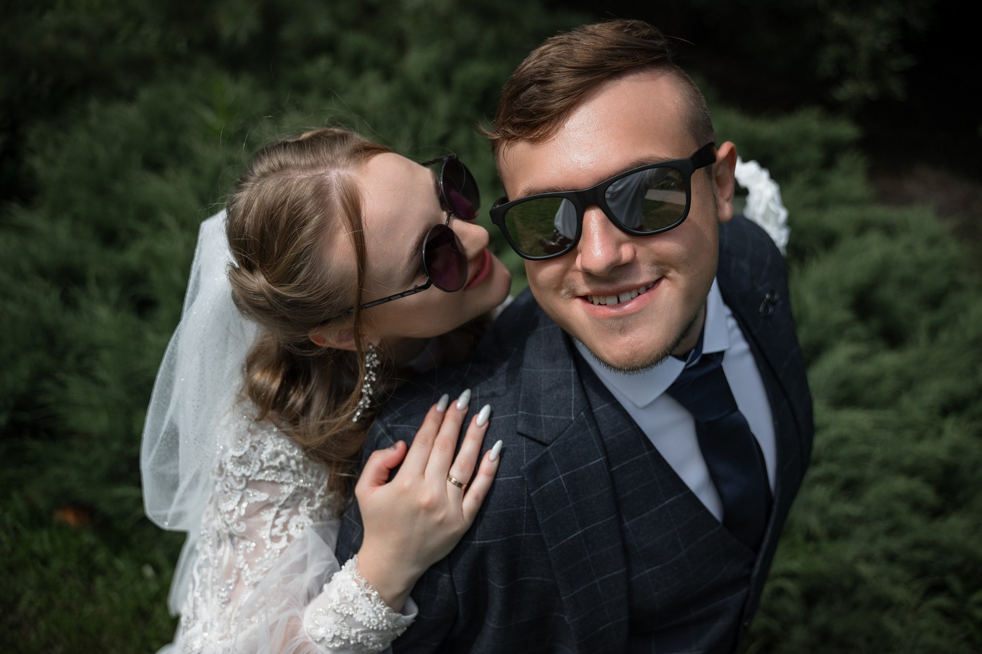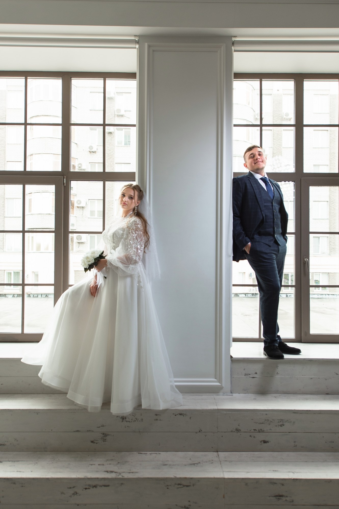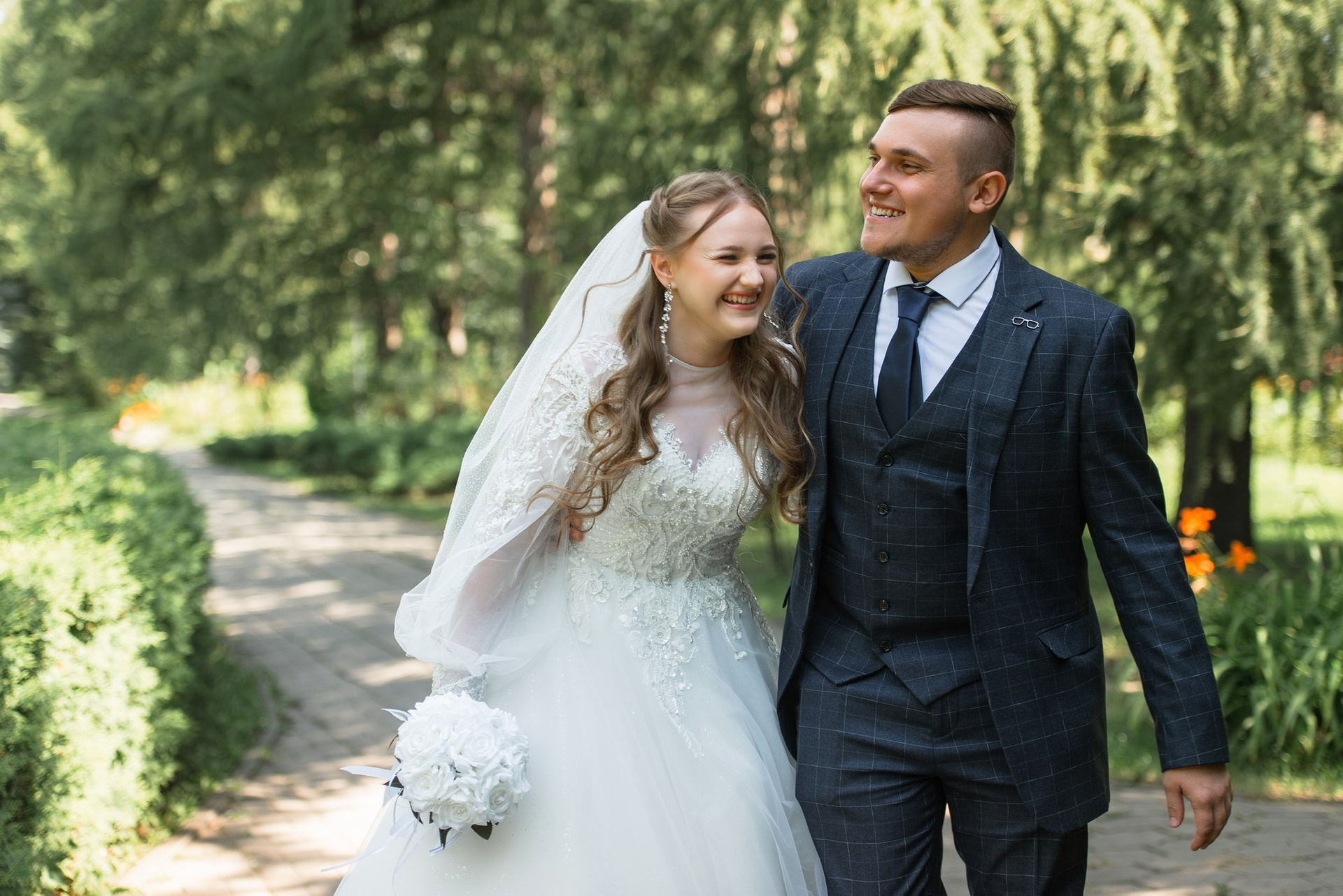 Свадебная фотосъёмка из двух блоков: сначала погуляли в зелени в дендропарке, а затем заехали в студию.