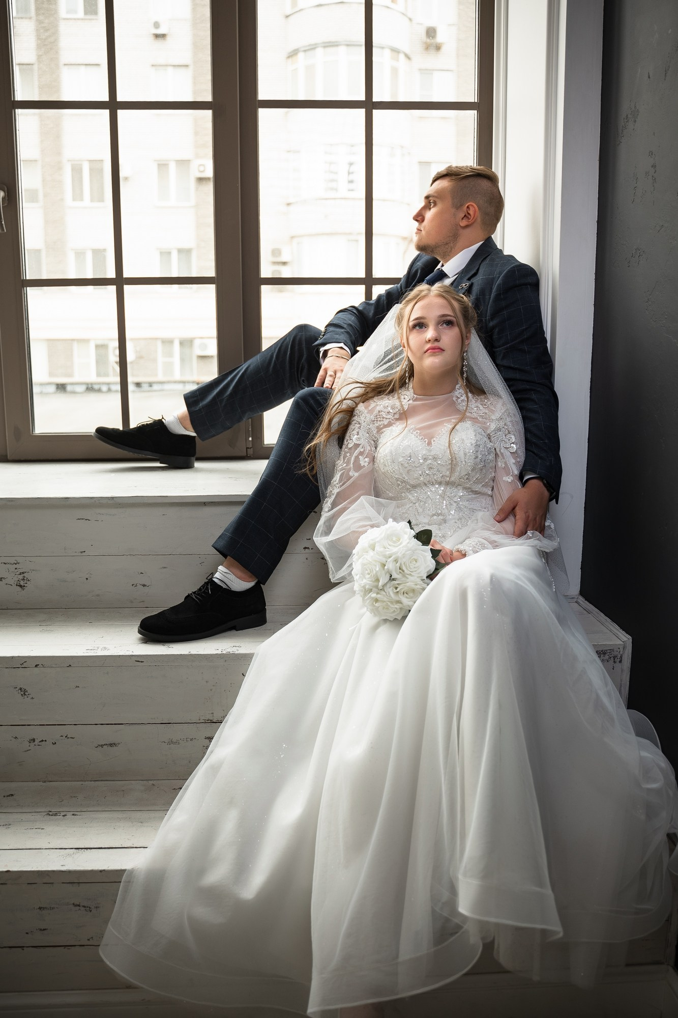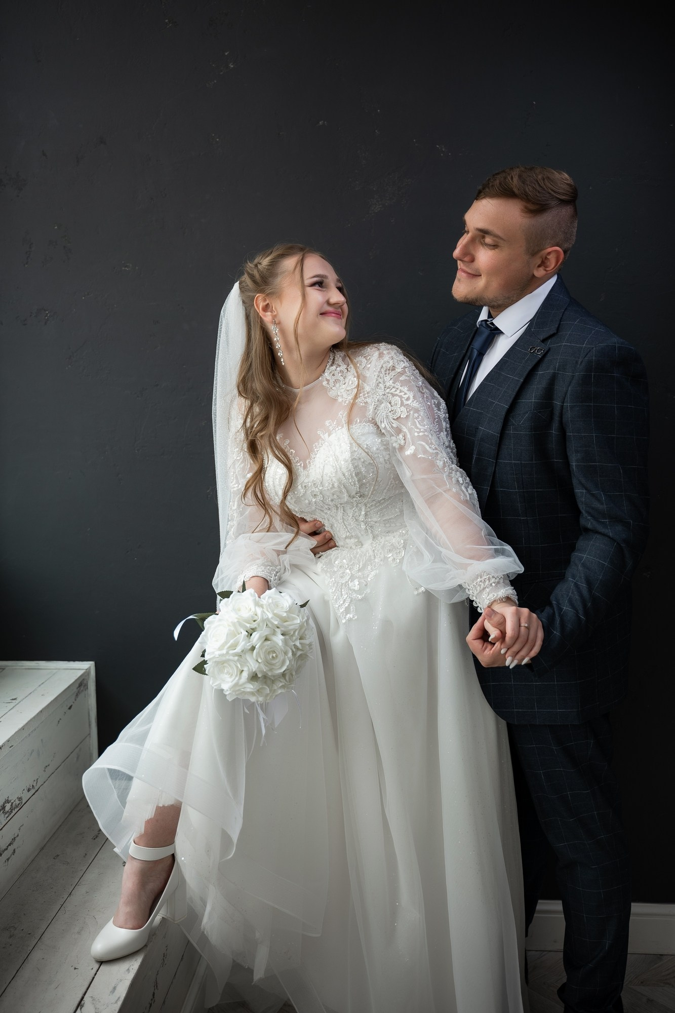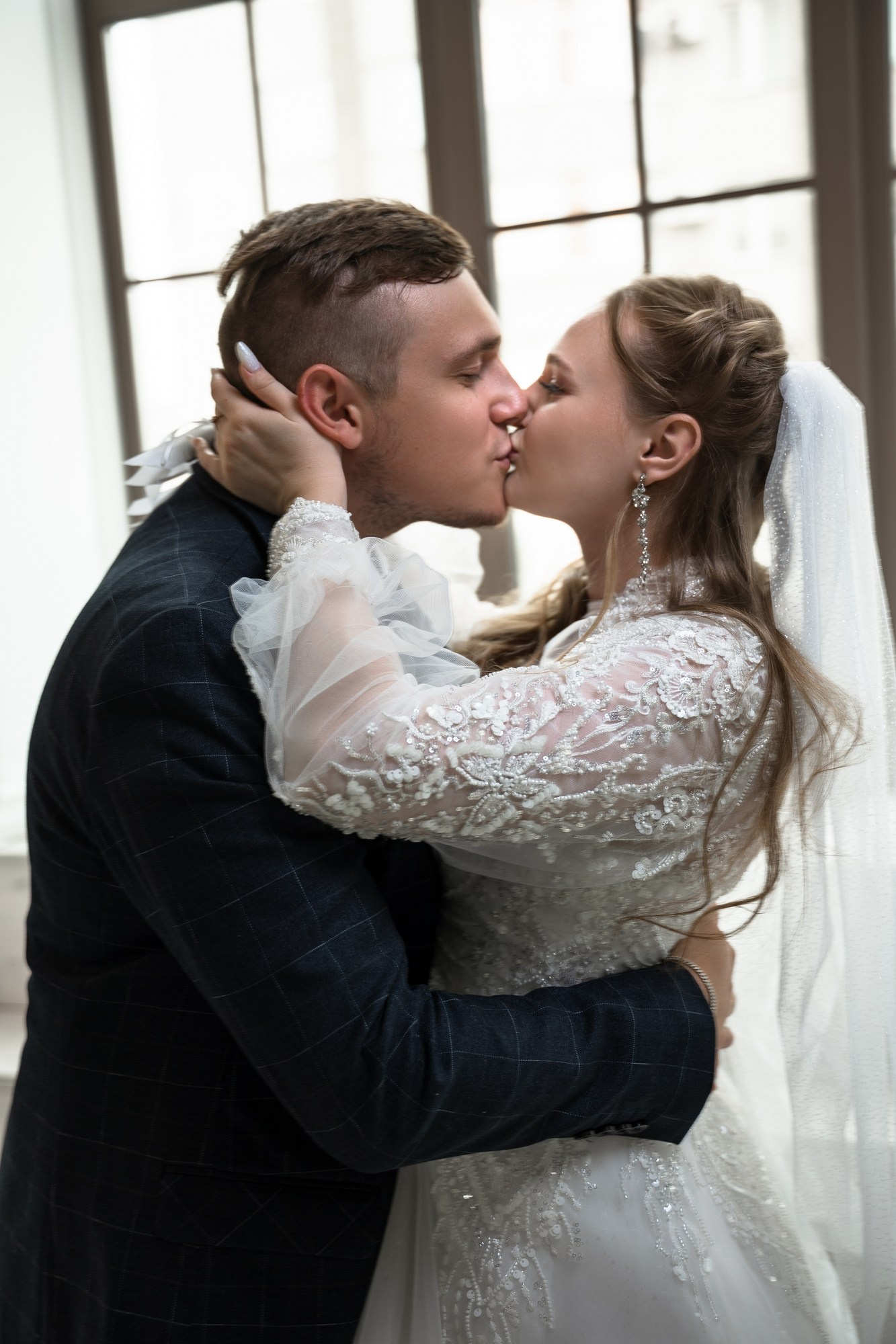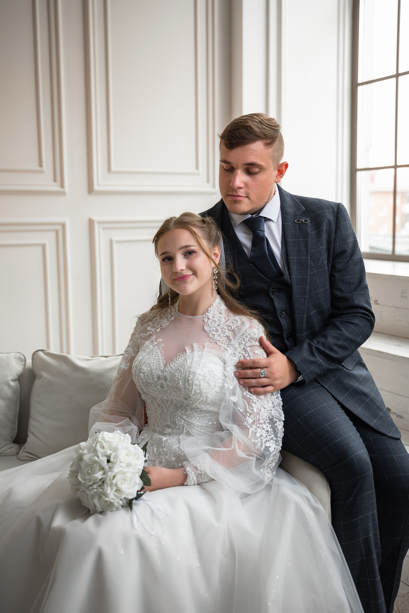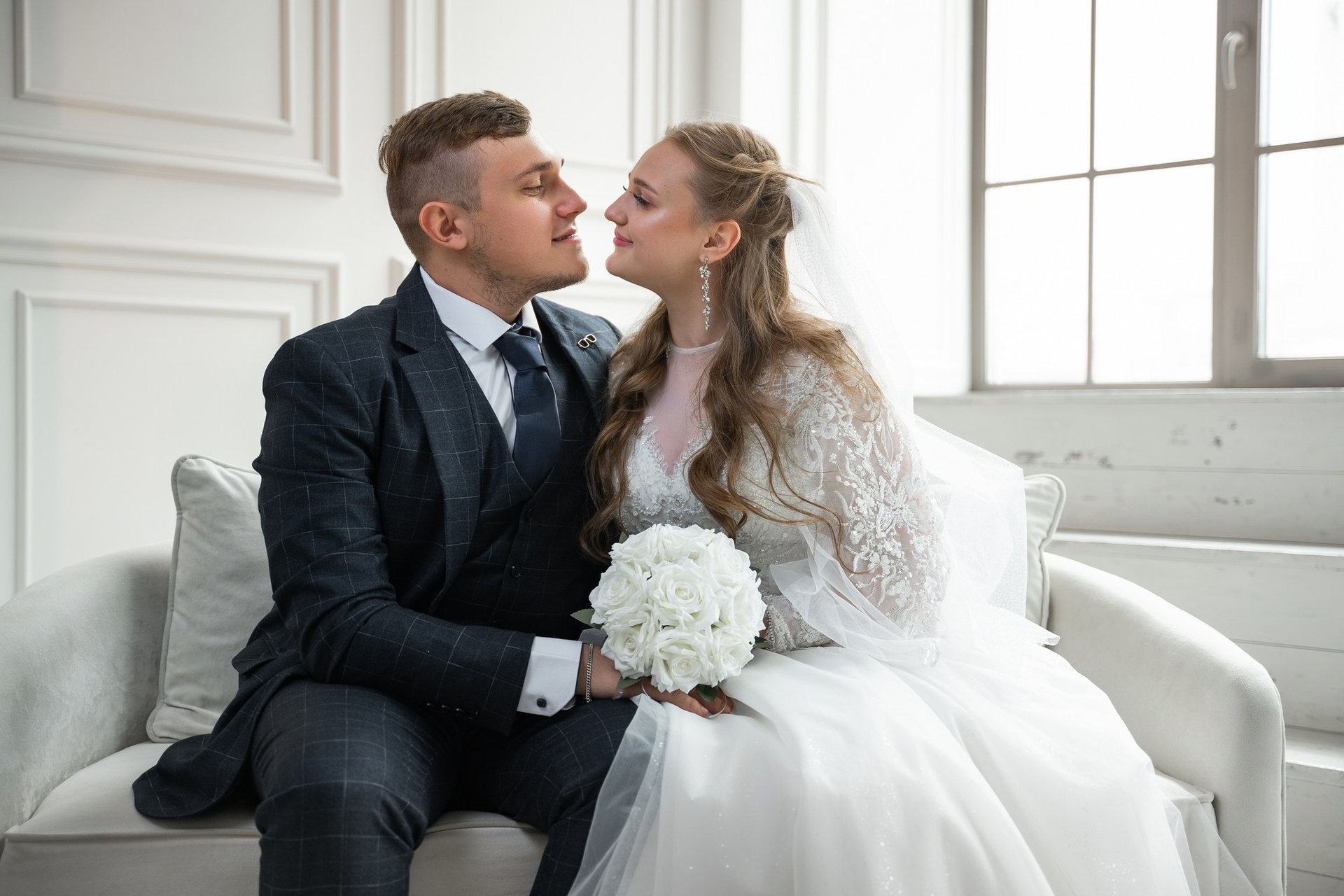 Свадебная фотосъёмка из двух блоков: сначала погуляли в зелени в дендропарке, а затем заехали в студию.