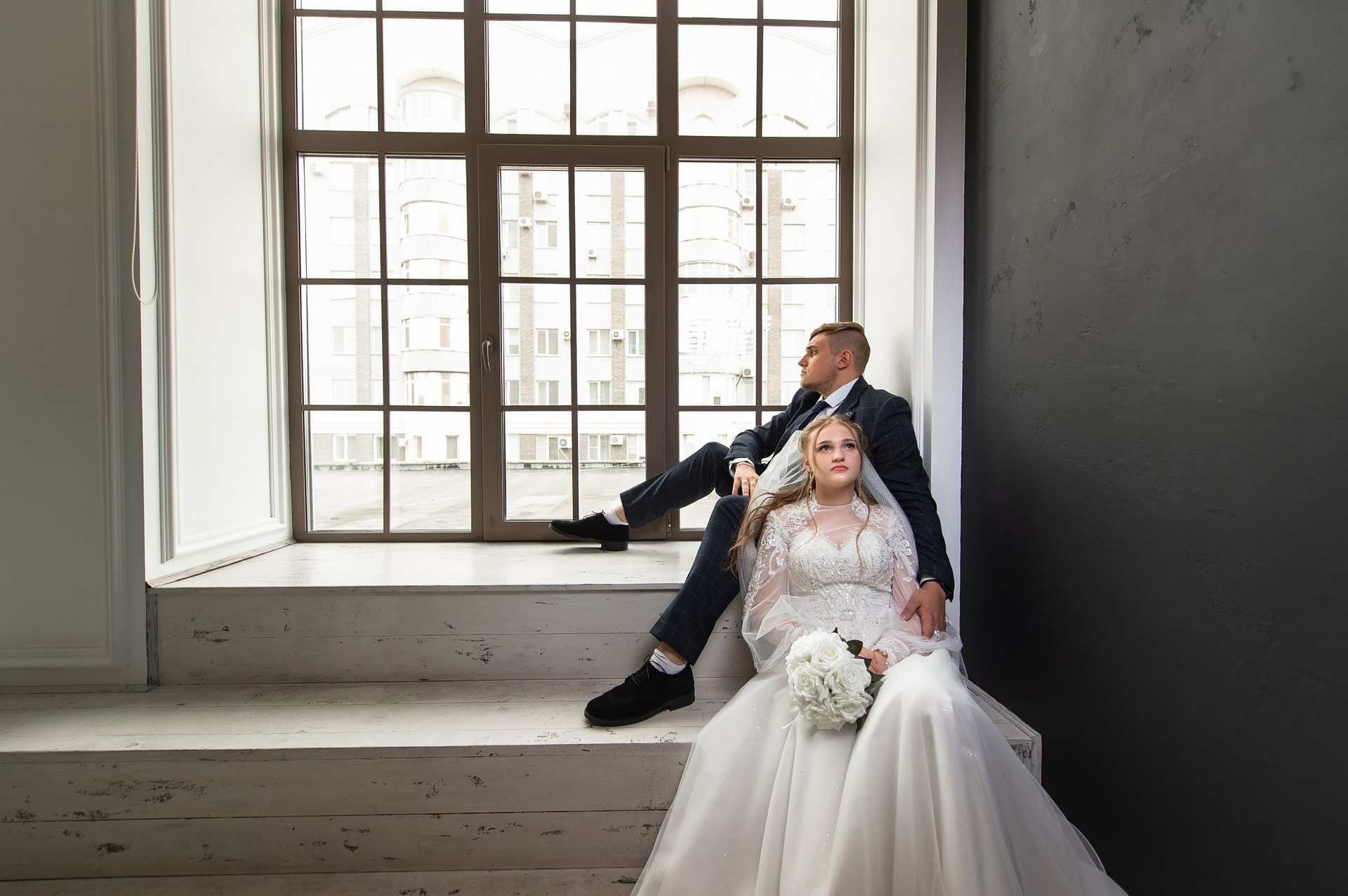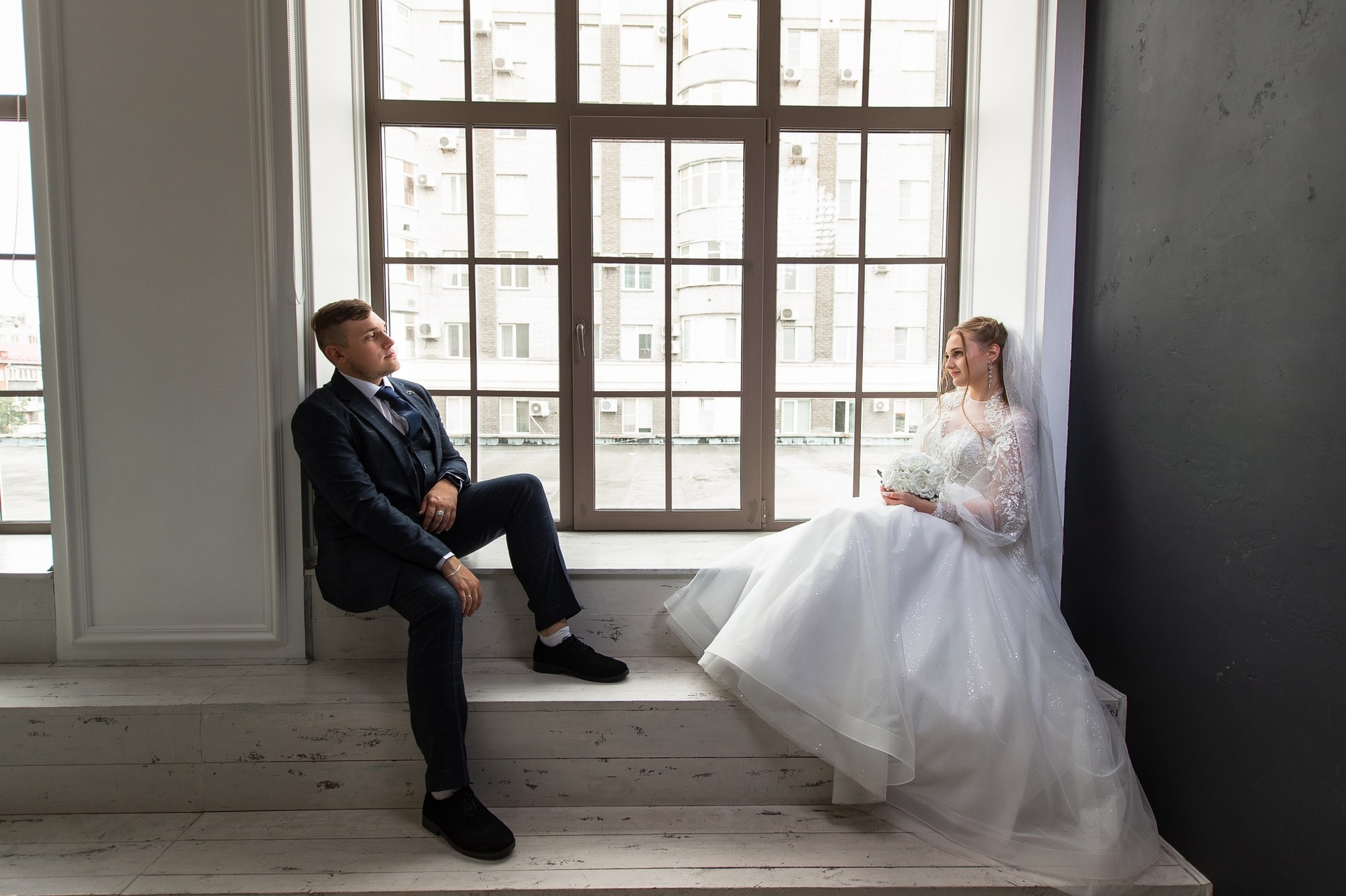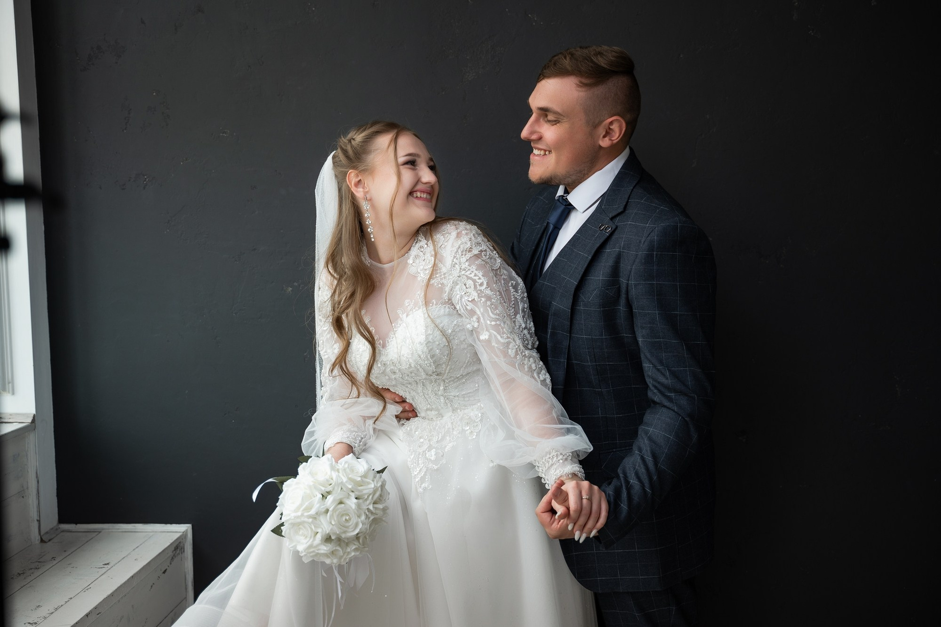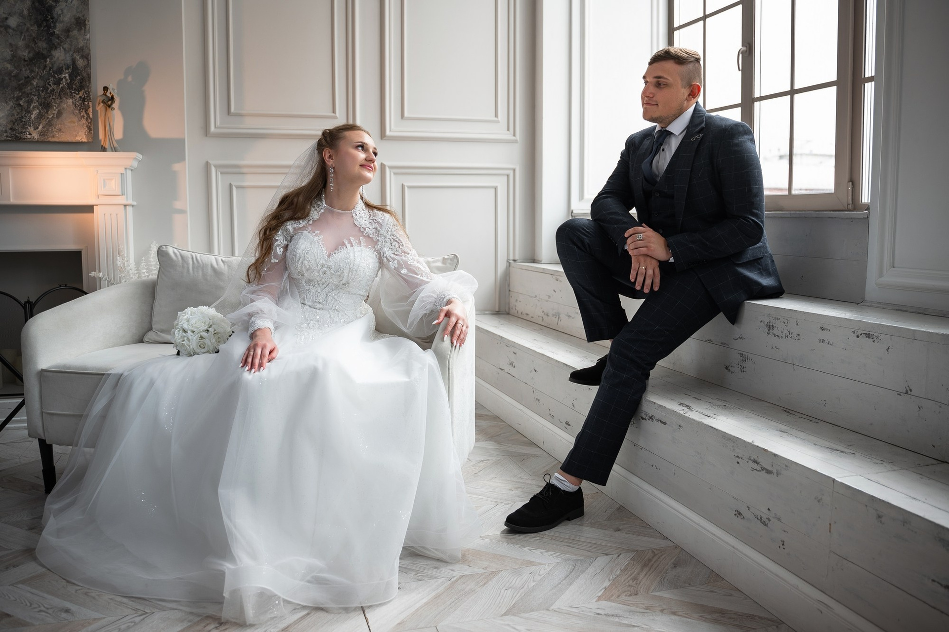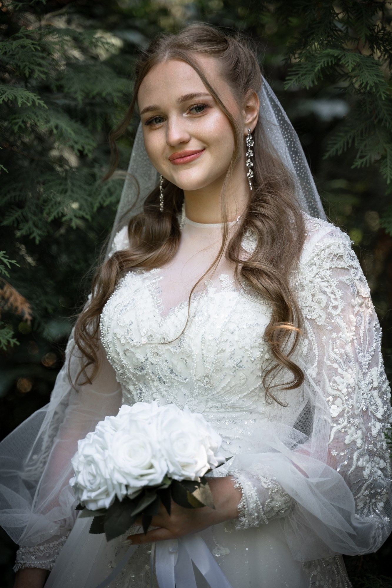 Свадебная фотосъёмка из двух блоков: сначала погуляли в зелени в дендропарке, а затем заехали в студию.
