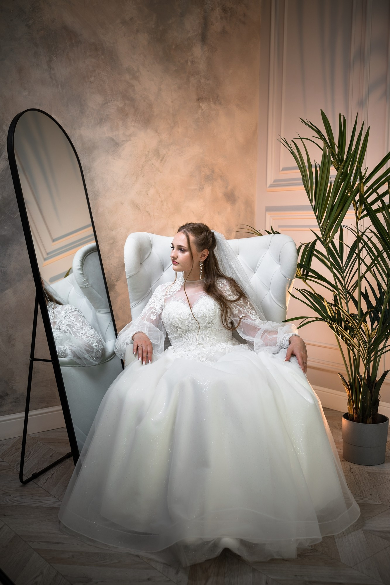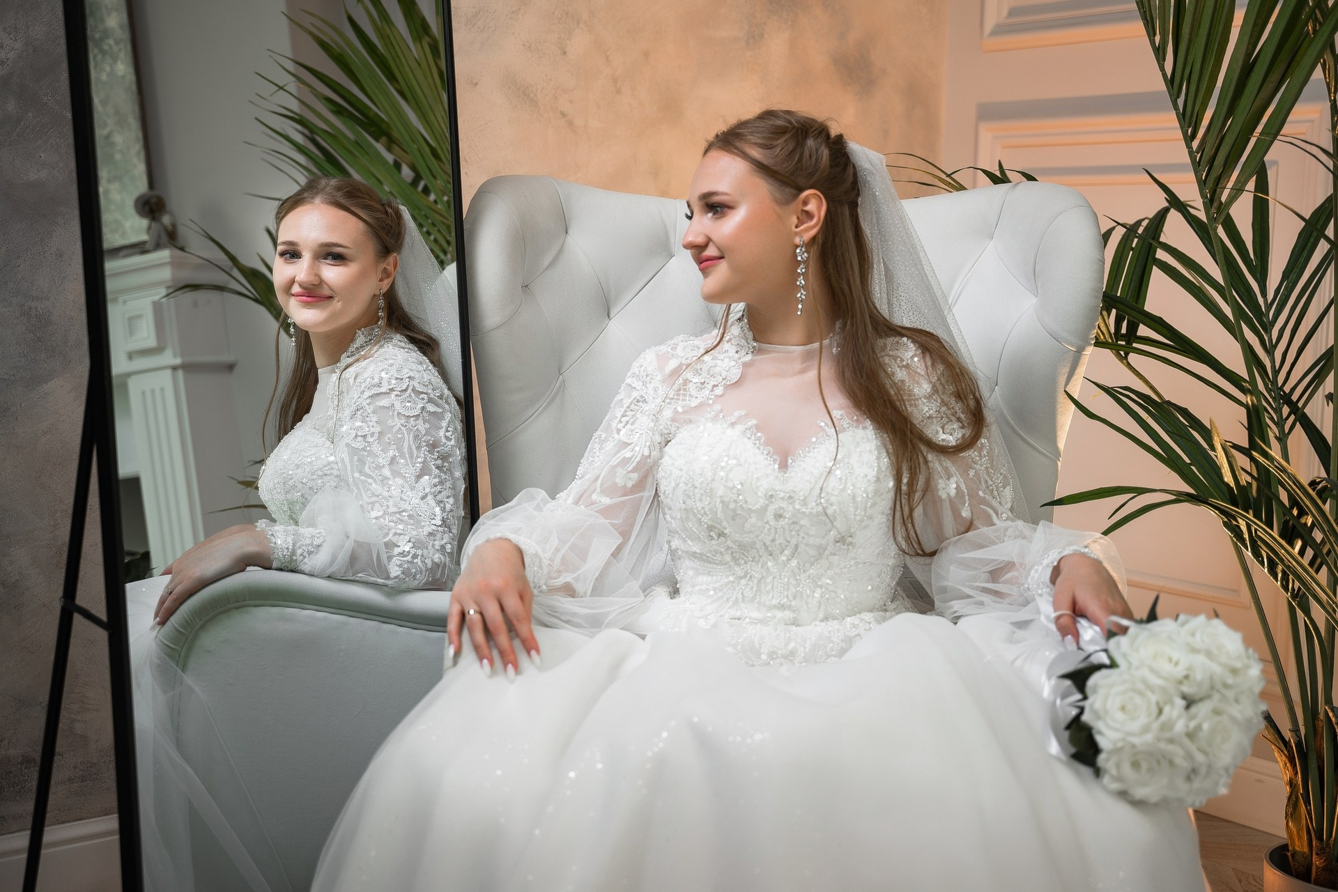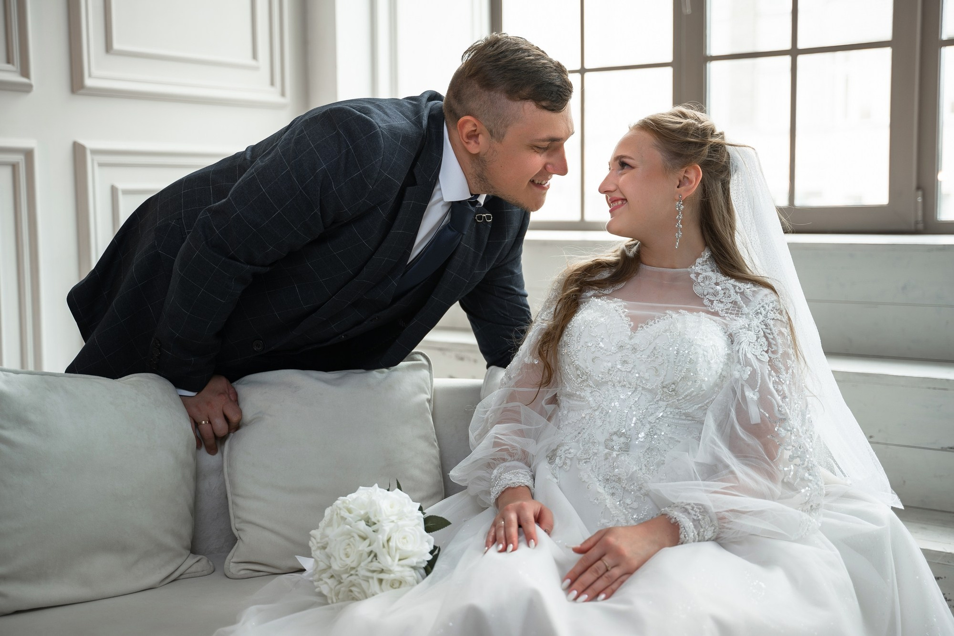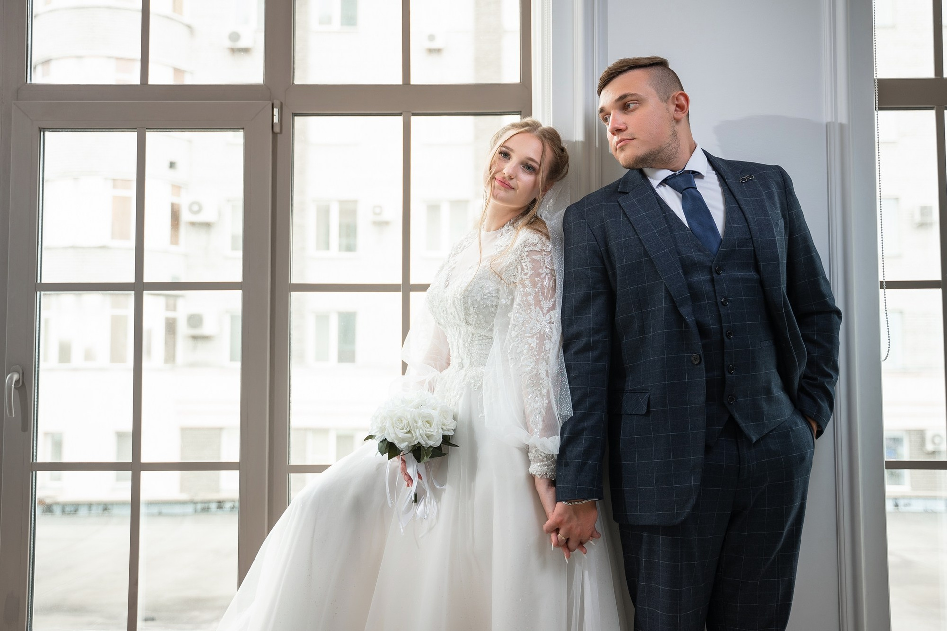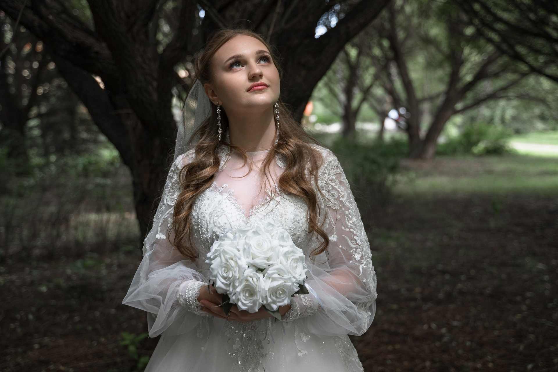 Свадебная фотосъёмка из двух блоков: сначала погуляли в зелени в дендропарке, а затем заехали в студию.